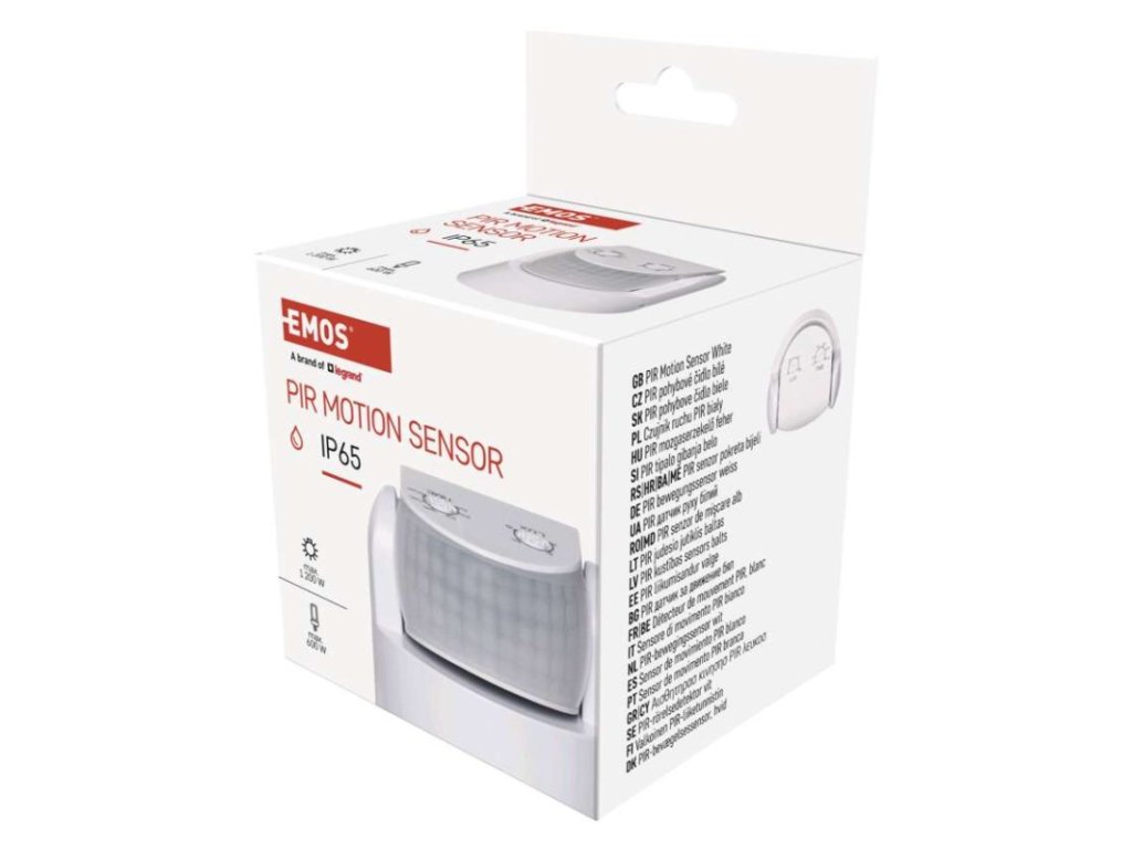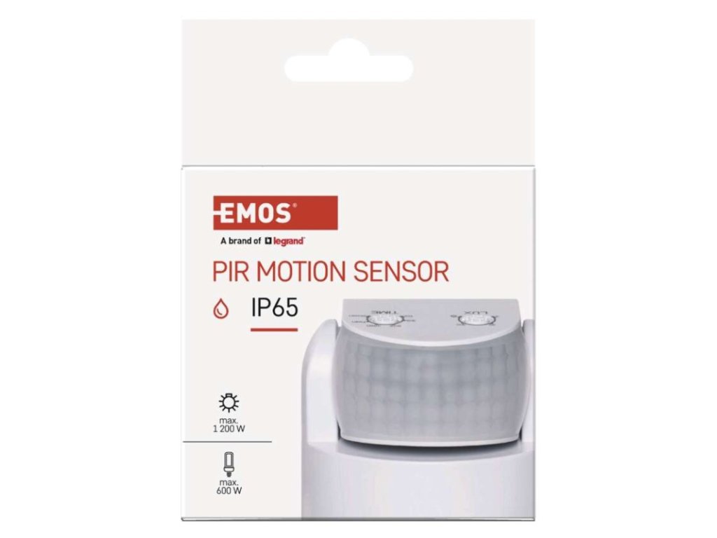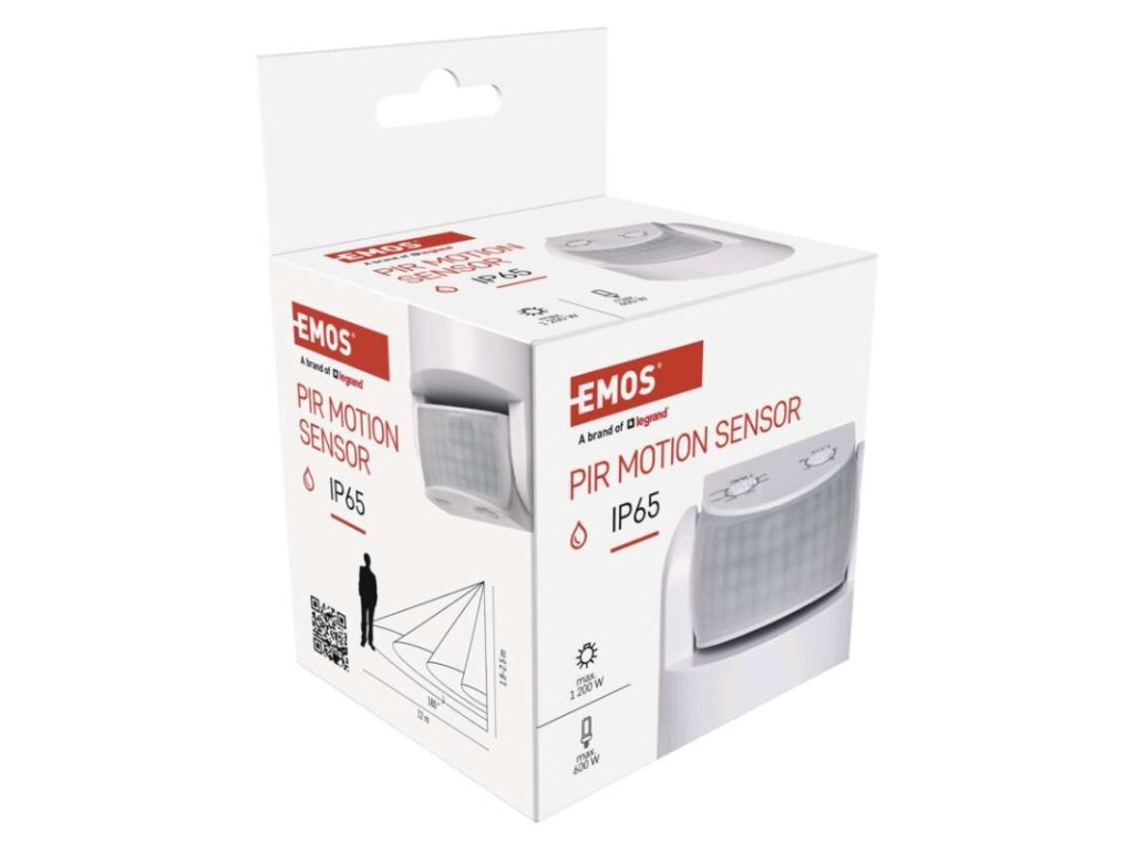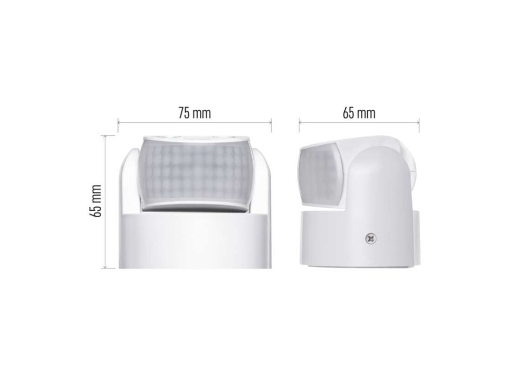 barva: bílá|citlivost: <3 Lux|detekční dosah: 12 m|detekční úhel: 180°|doba sepnutí: min. 10 sekund – max. 15 minut|krytí: IP65|max. zátěž kapacitní: 600 W|max. zátěž odporová: 1 200 W|napájení: 230 V~/50 Hz|prodejní obal: 1 ks, krabička|rozměr: 75 × 65 × 65 mm|typ senzoru: PIR
