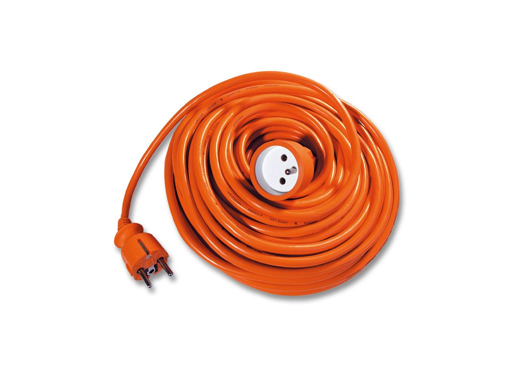 Standardní pohyblivý přívod-spojka oranžové barvy pro vniřní použití s dětskými clonkami. Zásuvka a vidlice je vyrobena z plastu, izolace z PVC.