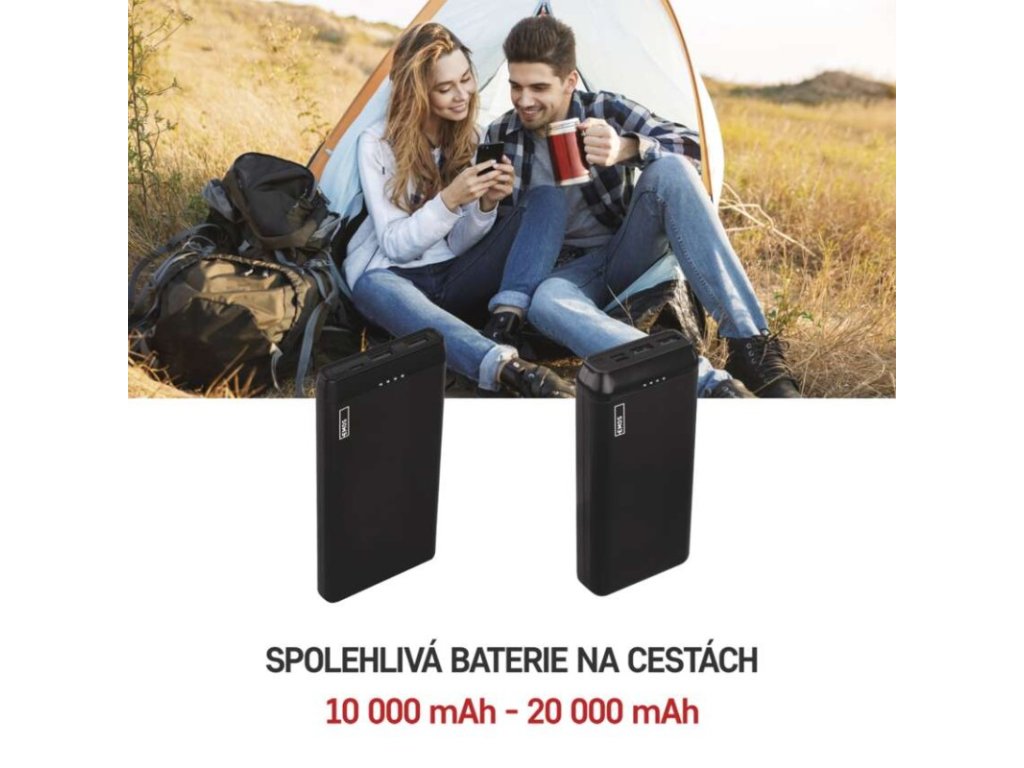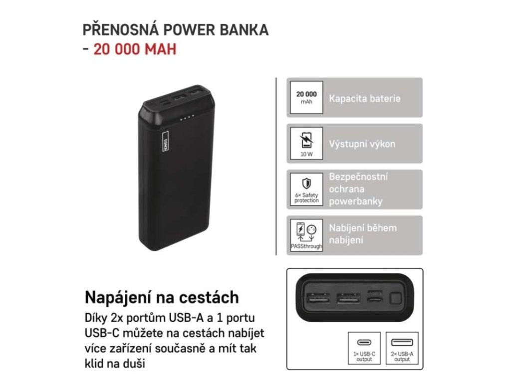 auto ON/OFF: ano|barva: černá|doba nabíjení: 12 hodin|hmotnost: 412 g|kapacita akumulátoru: 20 000 mAh/74 Wh|LED indikátor nabíjení: ano|LED indikátor stavu baterie: ano|materiál: ABS plast|max. vstupní výkon: 10 W|max. výkon drátového nabíjení: 10 W|ochrana proti podbití: ano|ochrana proti přebití: ano|ochrana proti přetížení: ano|ochrana proti zkratu: ano|passthrough: ano|přibalený kabel: USB-A/USB-C, data|prodejní obal: 1 ks, papírová krabička|provozní teplota: 0 °C až +40 °C|rozměr: 142 × 67 × 27 mm|rychlé nabíjení: ne|typ akumulátoru: Li-Po 3,7 V|typ vstupního rozhraní: 1× micro USB, 1× USB-C|typ výstupního rozhraní: 2× USB-A, 1× USB-C|záruční doba: 2 roky