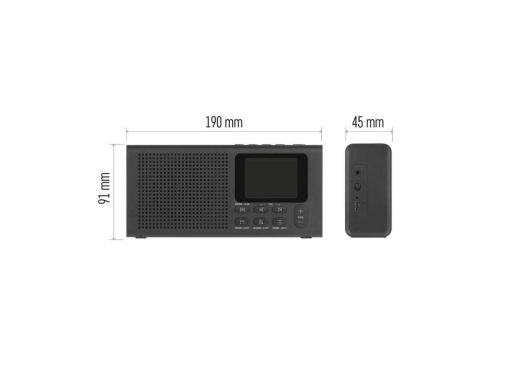 anténa: teleskopická s kloubem|barva: černá|bluetooth pro připojení např. telefonu, tabletu: ano|displej: barevný displej 2,4" TFT|doba provozu na baterii: dle použitých baterií|dosah bluetooth: 10 m|frekvence tuneru: 87,5–108 Mhz/174,9–239,2 Mhz|frekvenční rozsah reproduktoru: neuvádí se|funkce budíku: ano|funkce handsfree: ne|hmotnost: 337 g|integrovaný mikrofon: ne|napájecí zdroj součástí dodávky: ano|napájení: 4× AA 1,5 V (tužka)|odstup signálu/šum: neuvádí se|podpora MP3: ne|potlačení signálu: neuvádí se|prodejní obal: 1 ks, krabice|rádio: DAB/DAB+/FM|reproduktor: 50 mm/4 Ohm/3 W|rozměr: 190 × 91 × 45 mm|rozsah dekodéru MP3: neuvádí se|typ baterie: AA (tužka)|USB vstup: ne|verze bluetooth: 5.0|vstup AUX: ne|vstup pro microSD kartu: ne|výstup na sluchátka: ano