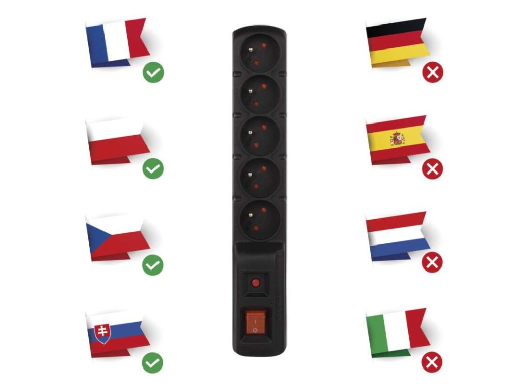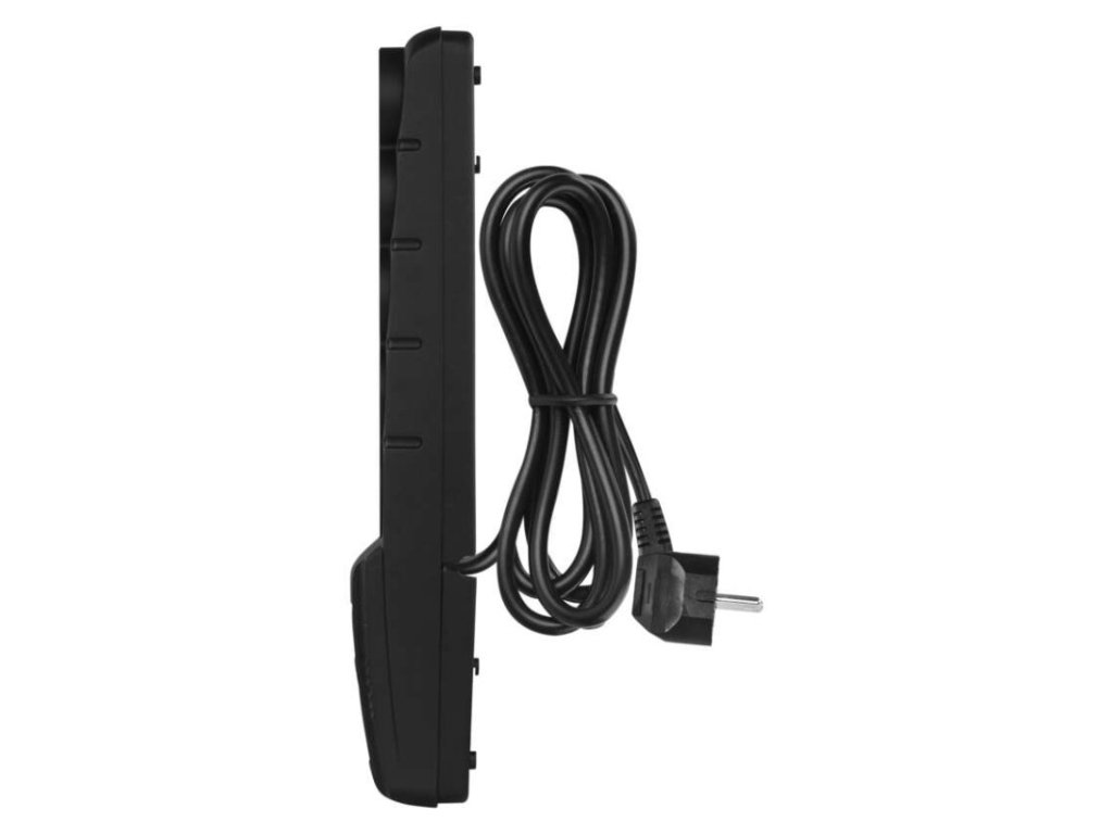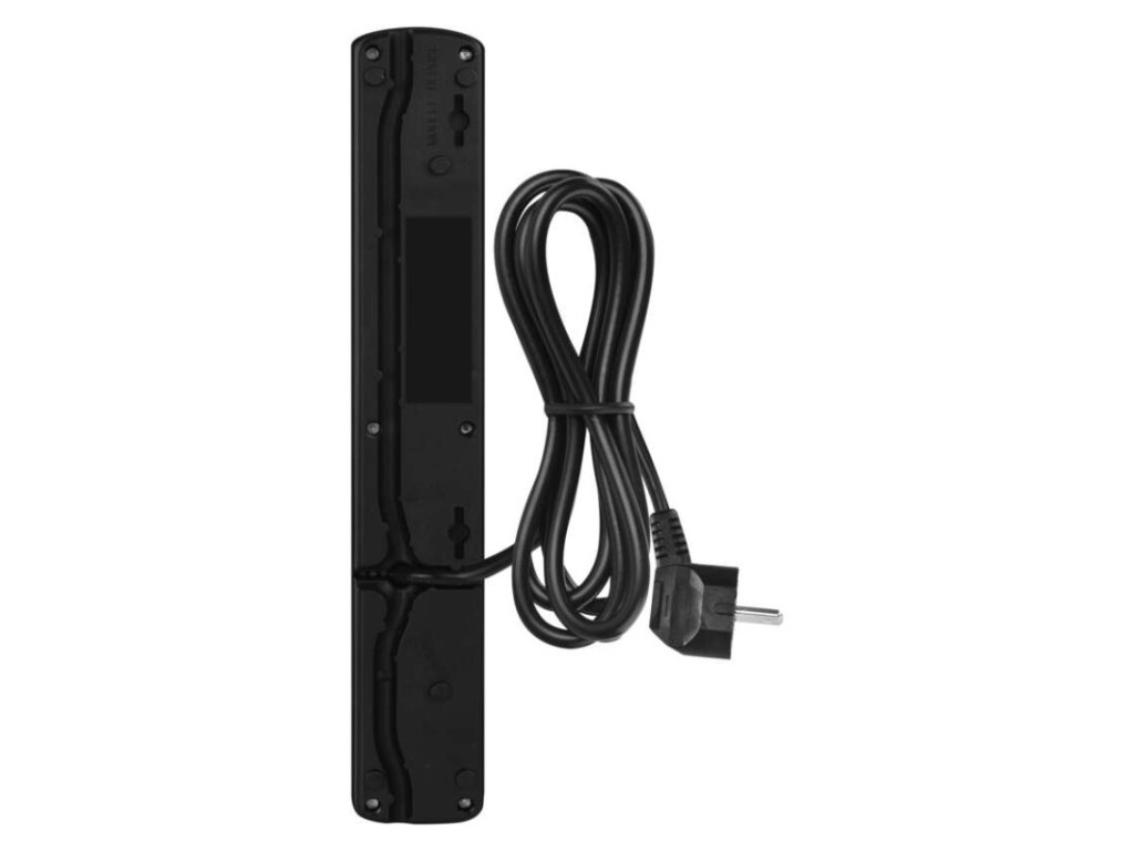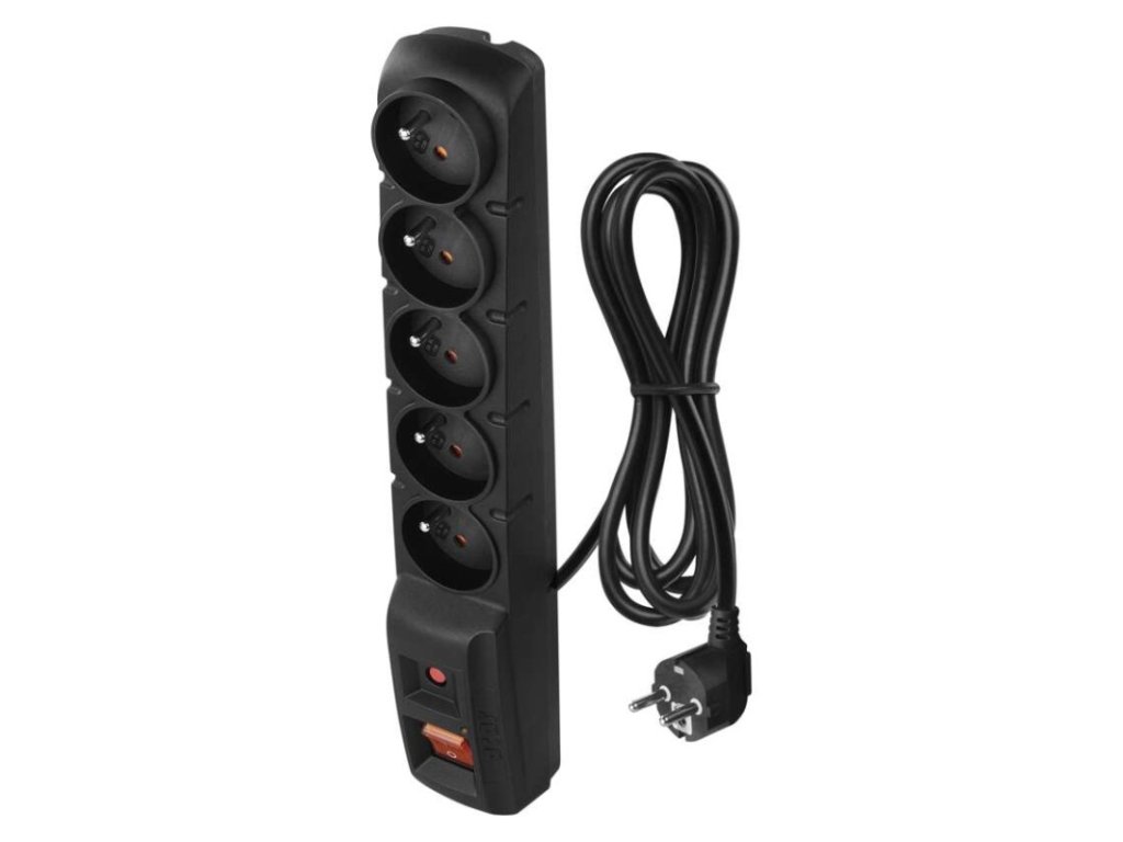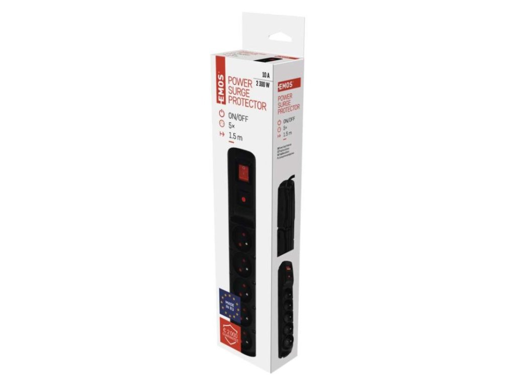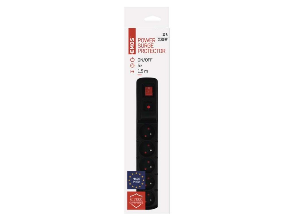 absorpce energie: 150 J|anténní (koaxiální ochrana): ne|barva: černá|délka: 1,5 m|dětské clonky: ano|doba odezvy: <25 ns|EMI/RFI filtr: ne|garance: 2 000 €|indikátor přepětí: ano|indikátor zapojení: ne|jištení: pojistka s čas. zpož. 10 A/250 V|jmenovité napětí: 250 V~, 50 Hz|max. proudová zátěž: 10 A max.|max. zátěž: 2 300 W|ochrana proti přetížení: ano|ochranná úroveň Up: 1,3 kV (L/N)|počet zásuvek: 5× 2P + PE|prodejní obal: 1 ks, krabice|rozměr: 330 × 54 × 55 mm|rozsah kmitočtu: neuvádí se|tel. / fax / DSL ochrana: ne|USB výstup: ne|útlum: neuvádí se|vodič: H05VV-F3G 1,0 mm²|zkušební vlna U0c: 4 kV