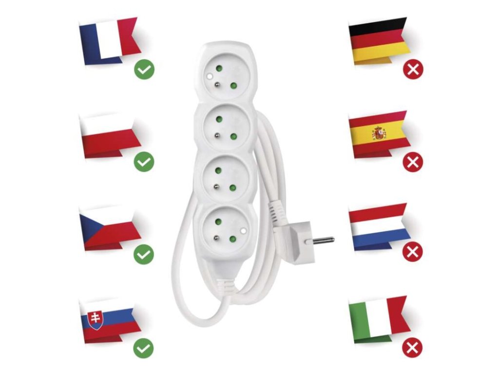 barva: bílá|další funkce: ne|délka: 1,5 m|dětské clonky: ano|jazyky aplikace: –|kompatibilita: –|krytí: IP20|materiál zásuvky a vidlice: plast|max. zátěž: 3 680 W|napětí: 250 V~|notifikace do mobilní aplikace: ne|ovládání hlasovými asistenty: ne|počet zásuvek: 4|podporované OS: –|přenosová frekvence: –|prodejní obal: 1 ks, závěs|protokol: –|proud: 16 A max.|průřez vodiče: 1,0 mm²|typ izolace: PVC|USB výstup: ne|vodič: H05VV-F3G|vypínač: ne