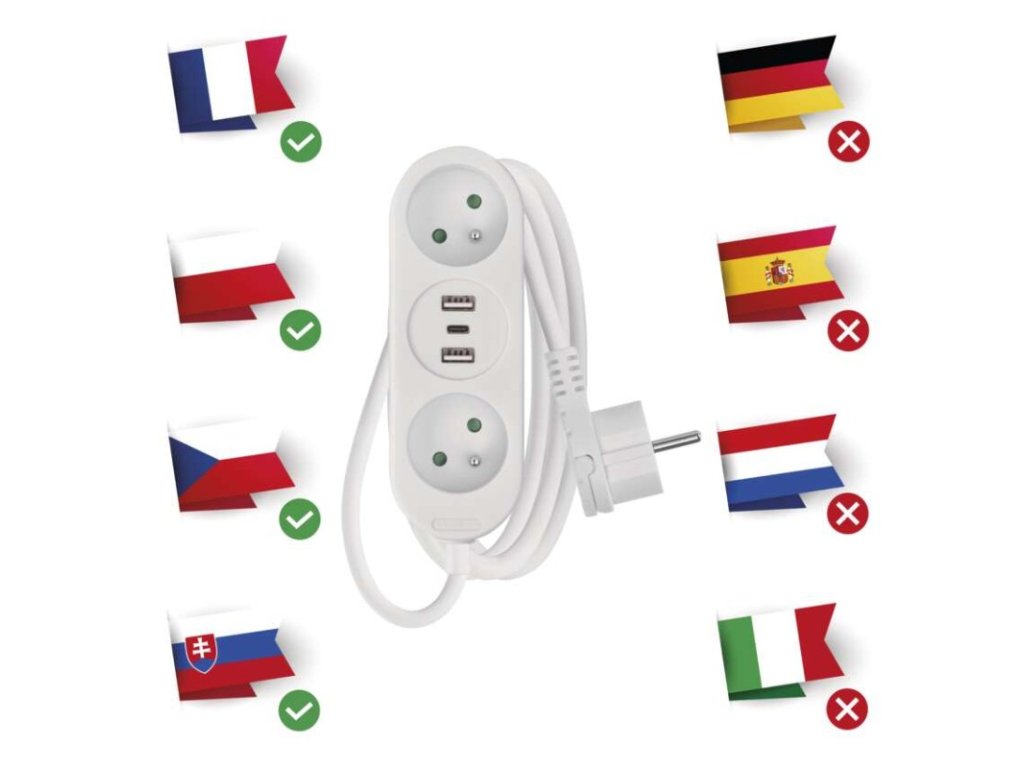 barva: bílá|další funkce: ne|délka: 2 m|dětské clonky: ano|jazyky aplikace: –|kompatibilita: –|krytí: IP20|materiál zásuvky a vidlice: plast|max. zátěž: 3 680 W|napětí: 230 V~|notifikace do mobilní aplikace: ne|ovládání hlasovými asistenty: ne|počet zásuvek: 2× 2P + PE|podporované OS: –|přenosová frekvence: –|prodejní obal: 1 ks, závěs|protokol: –|proud: 16 A max.|průřez vodiče: 1,0 mm²|typ izolace: PVC|USB výstup: 2× USB typ A + 1× USB typ C ; 5 V DC; total ∑ 3,4 A (17 W) max.|vodič: H05VV-F3G|vypínač: ne