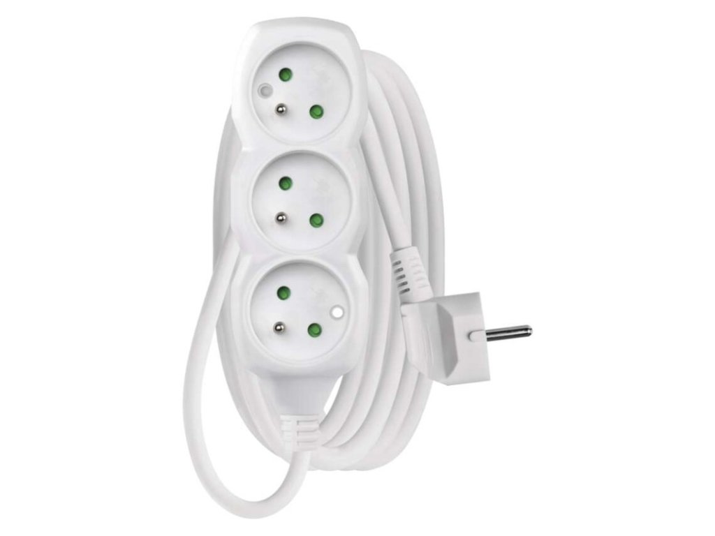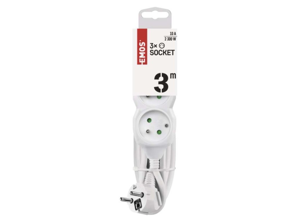 barva: bílá|délka: 3 m|dětské clonky: ano|krytí: IP20|materiál zásuvky a vidlice: plast|max. zátěž: 2 300 W|napětí: 250 V~|počet zásuvek: 3|prodejní obal: 1 ks, závěs|proud: 10 A max.|průřez vodiče: 1,0 mm²|typ izolace: PVC|USB výstup: ne|vodič: H05VV-F3G|vypínač: ne