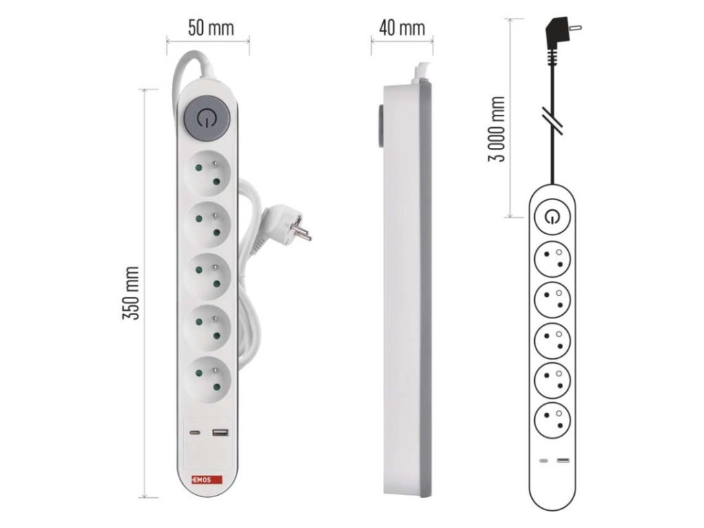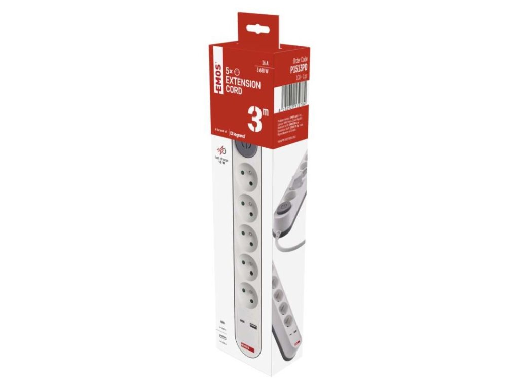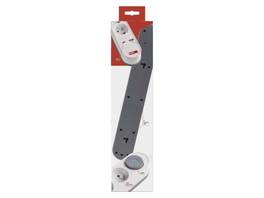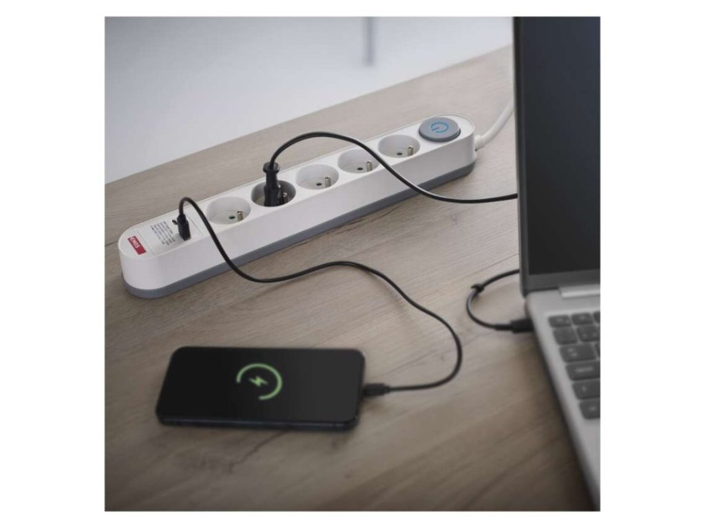 barva: bílá, šedá|další funkce: ne|délka: 3 m|dětské clonky: ano|jazyky aplikace: –|kompatibilita: –|krytí: IP20|materiál zásuvky a vidlice: PC (polykarbonát)|max. zátěž: 3 680 W|napětí: 250 V~|notifikace do mobilní aplikace: ne|ovládání hlasovými asistenty: ne|počet zásuvek: 5× 2P + PE|podporované OS: –|přenosová frekvence: –|prodejní obal: 1 ks, krabice|protokol: –|proud: 16 A max.|průřez vodiče: 1,5 mm²|typ izolace: PVC|USB výstup: 1× USB-A, 1× USB-C, total: 3,4 A – 17 W (fast charging)|vodič: H05VV-F3G|vypínač: ano