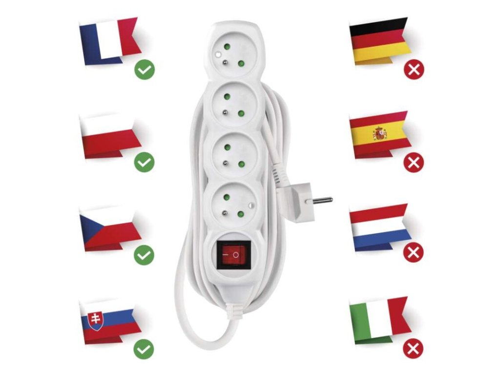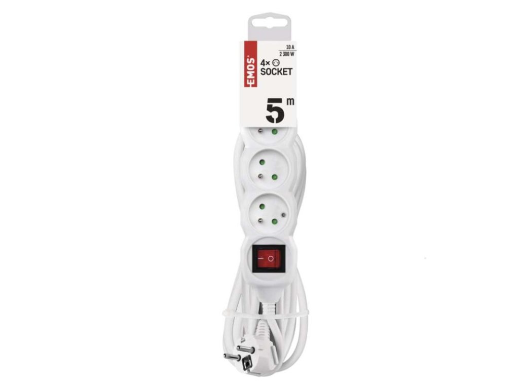 barva: bílá|délka: 5 m|dětské clonky: ano|krytí: IP20|materiál zásuvky a vidlice: plast|max. zátěž: 2 300 W|napětí: 250 V~|počet zásuvek: 4|prodejní obal: 1 ks, závěs|proud: 10 A max.|průřez vodiče: 1,0 mm²|typ izolace: PVC|USB výstup: ne|vodič: H05VV-F3G|vypínač: ano