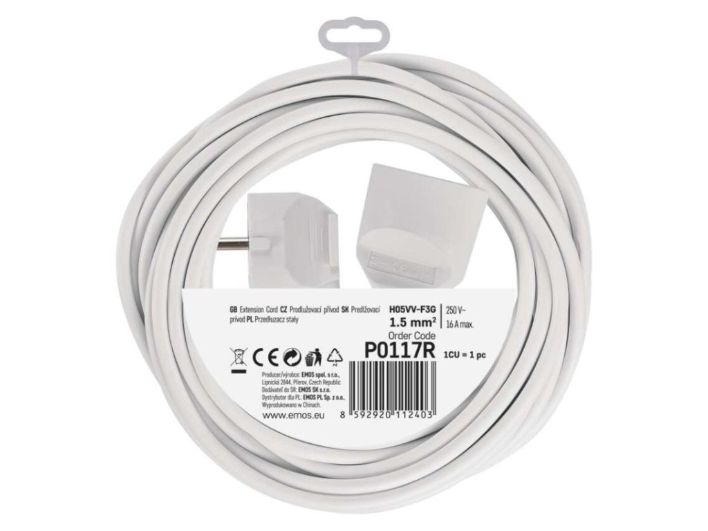 barva: bílá|délka: 7 m|dětské clonky: ano|krytí: IP20|materiál zásuvky a vidlice: plast|max. zátěž: 3 680 W|napětí: 250 V~|počet zásuvek: 1|prodejní obal: 1 ks, závěs|proud: 16 A max.|průřez vodiče: 1,5 mm²|typ izolace: PVC|USB výstup: ne|vodič: H05VV-F3G|vypínač: ne