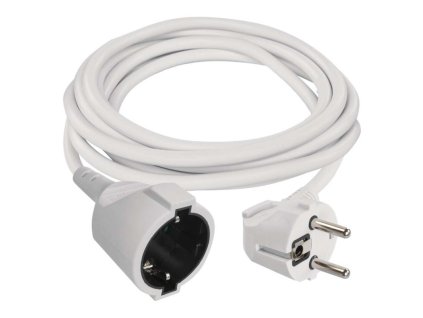 Standardní prodlužovací kabel bílé barvy pro vniřní použití s dětskými clonkami. Zásuvka a vidlice je vyrobena z plastu, izolace z PVC.