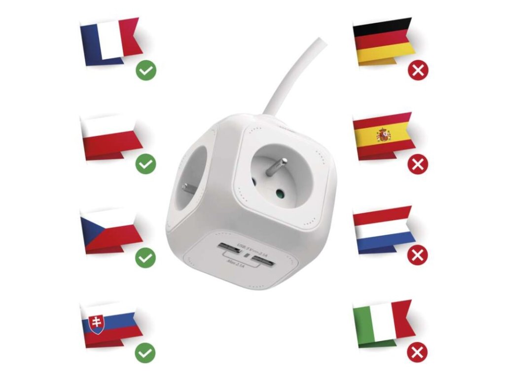 Prodlužovací kabel - kostka 1,9 m / 4 zásuvky / bílý / PVC / s USB / 1 mm2