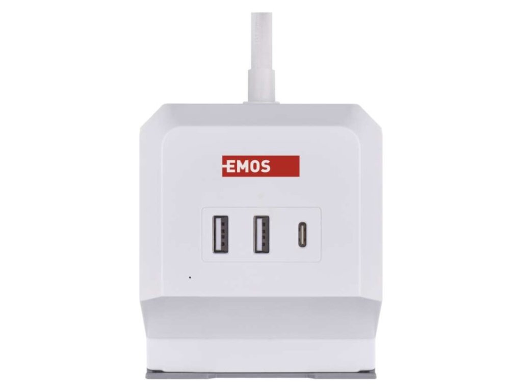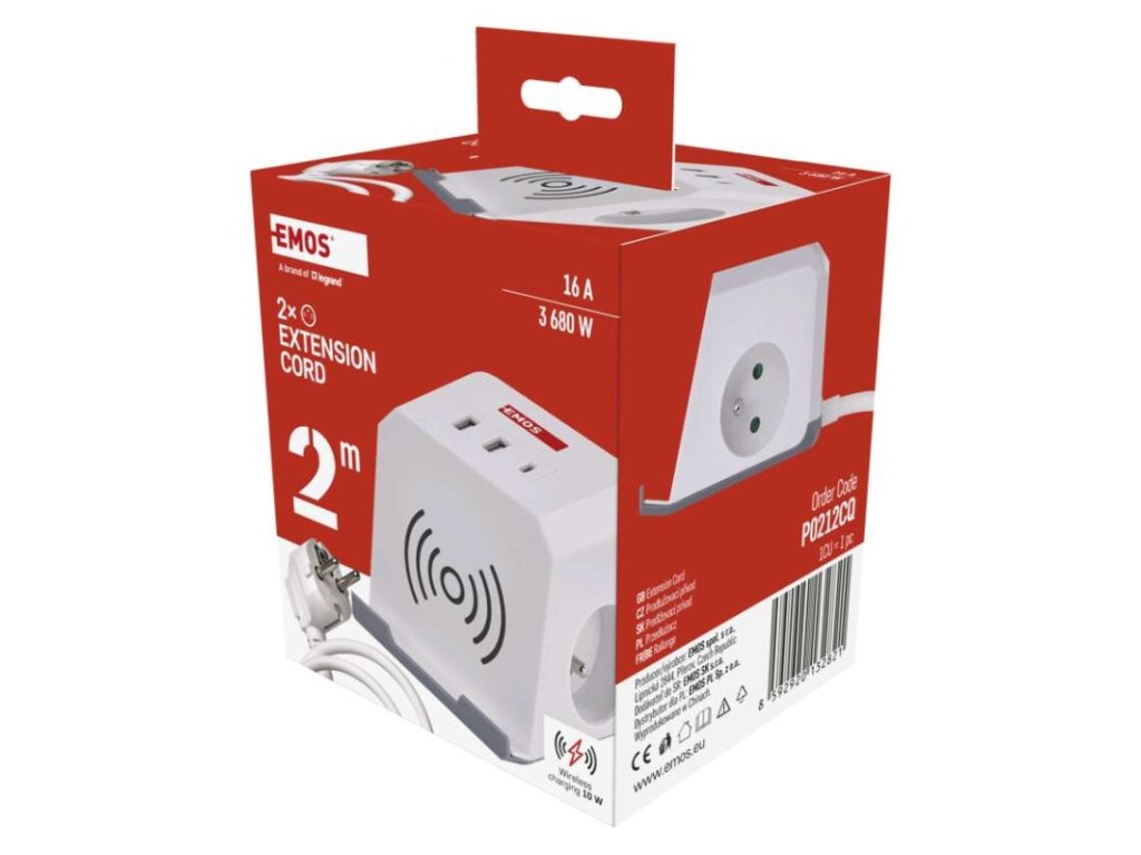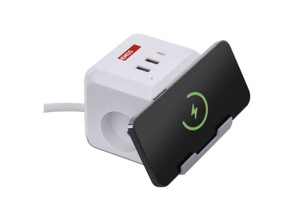 Prodlužovací kabel - kostka 2 m / 2 zásuvky / bílý / 2×USB-A + 1×USB-C+Qi / 1,5 mm2
