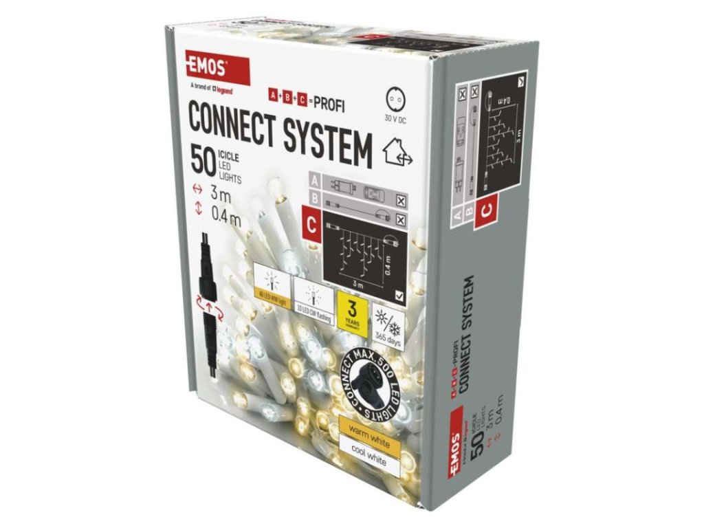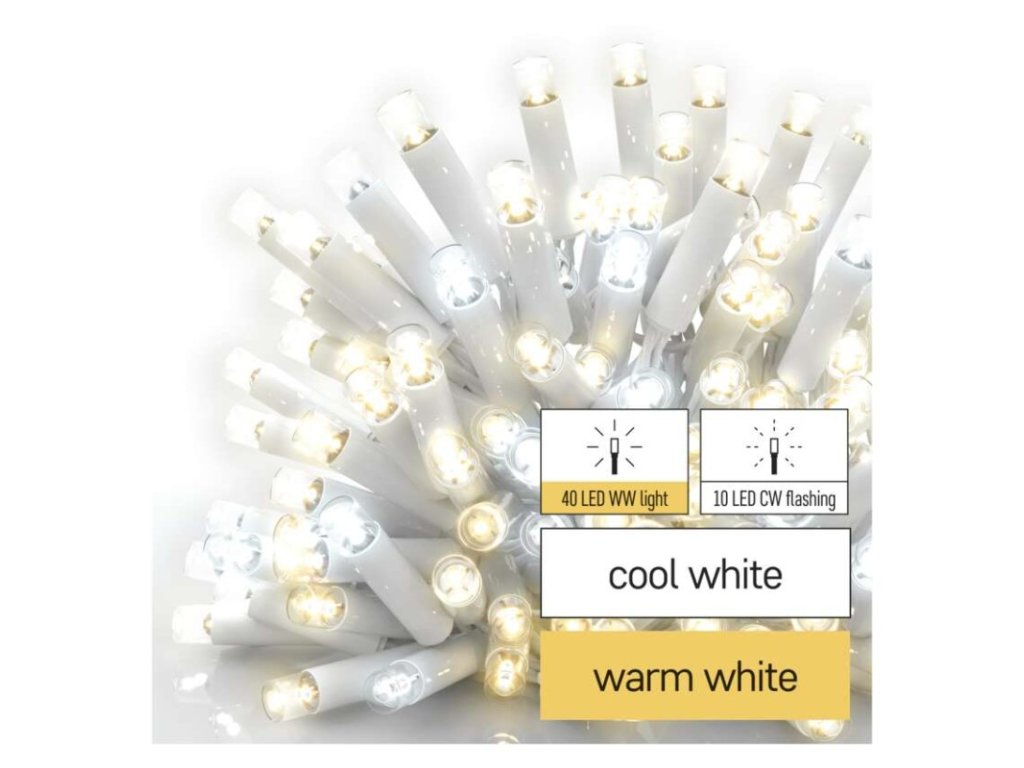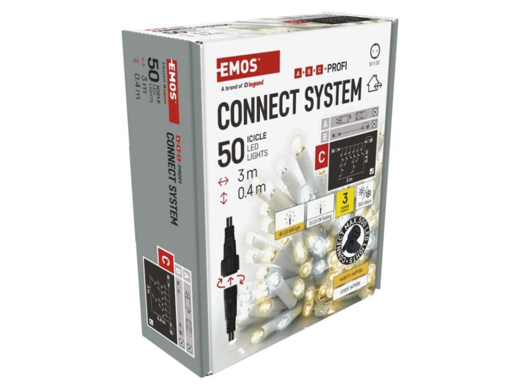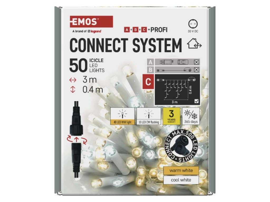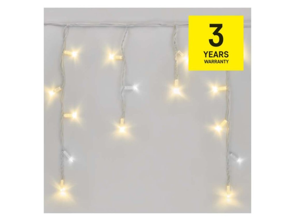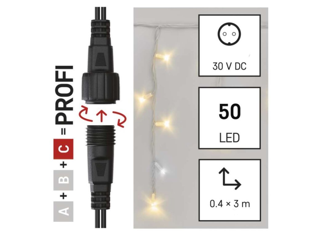 barva drátu: bílá|barva světla: teplá/studená bílá|časovač: neuvádí se|dálkový ovladač: ne|délka přívodu: 10 cm|funkce: svítí/bliká|krytí: IP44|LED mezera: 10 cm|materiál: guma|možnost propojení: ano|počet LED: 50|použití: venkovní i vnitřní|příkon: max. 4 W|prodejní obal: 1 ks, krabice|produkt: krápníky|pro výšku stromu: neuvádí se|rozměr: 3 × 0,4 m|tvar: klasický|typ napájení: síťový adaptér (není součástí balení)|velikost LED: 7 mm|vstupní napětí: 30 V DC|výstupní napětí: neuvádí se|záruční doba: 3 roky|životnost: 10 000 hodin