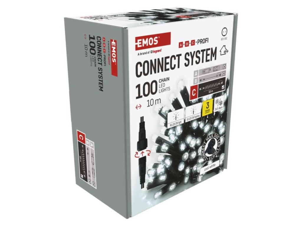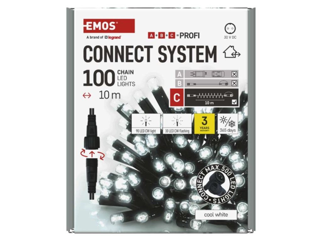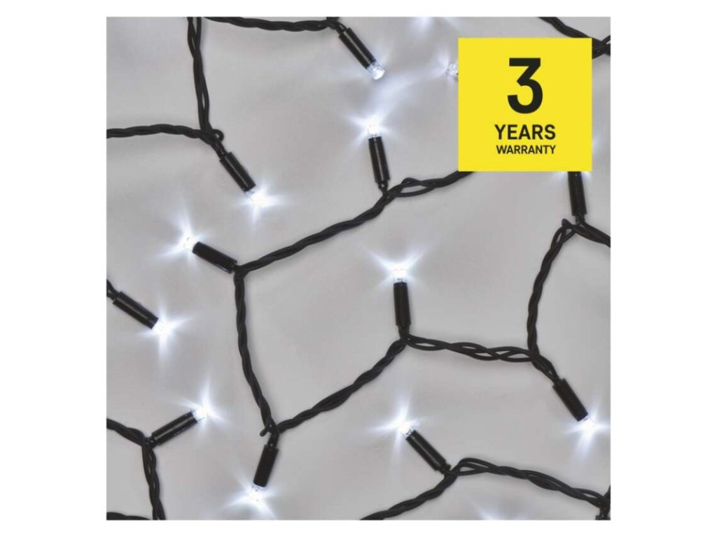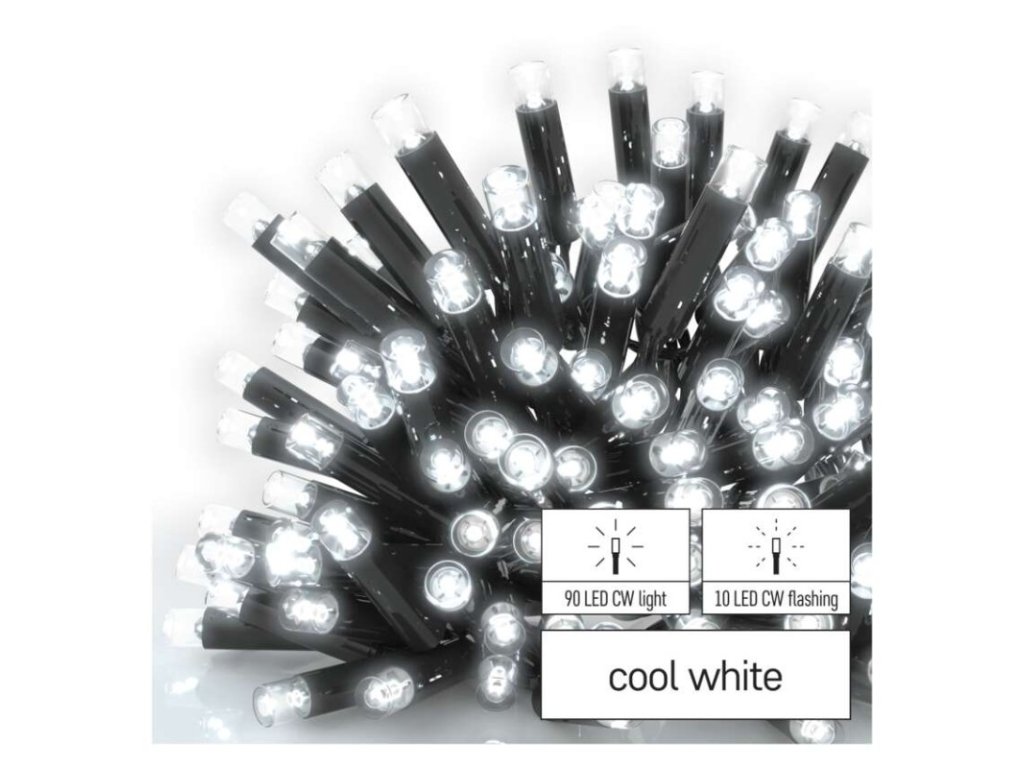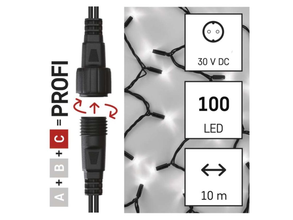 barva drátu: černá|barva světla: studená bílá|časovač: neuvádí se|dálkový ovladač: ne|délka přívodu: 10 cm|funkce: svítí/bliká|krytí: IP44|LED mezera: 10 cm|materiál: guma|možnost propojení: ano|počet LED: 100|použití: venkovní i vnitřní|příkon: max. 6 W|prodejní obal: 1 ks, krabice|produkt: řetěz|pro výšku stromu: neuvádí se|rozměr: 10 m|tvar: klasický|typ napájení: síťový adaptér (není součástí balení)|velikost LED: 7 mm|vstupní napětí: 30 V DC|výstupní napětí: neuvádí se|záruční doba: 3 roky|životnost: 10 000 hodin