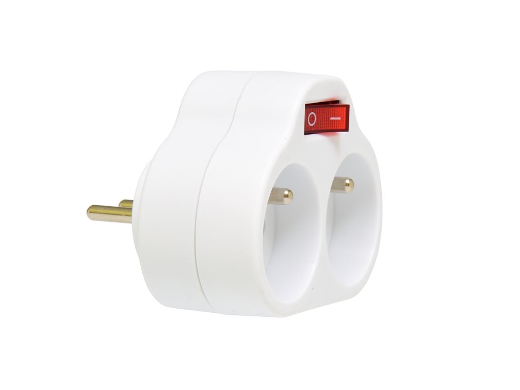 Standardní rozbočovací zásuvka bílé barvy pro vnitřní použití se 2 zásuvkami a včetně dětských clonek. Tato rozbočka je vybavena kolébkovým vypínačem, stupeň ochrany je IP20.