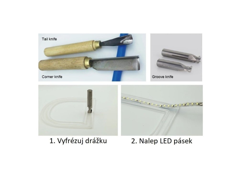 V nabídce příslušenství naleznete již zmíněnou gravírovací frézu pro frézování drážek na silikonový profil. Dále můžete zakoupit speciální nože pro úpravu profilu. V sadě naleznete nůž pro zakončování profilu a nůž pro nařezání profilu, aby šel poté ohnout do požadovaných úhlů. V případě použití průhledných plexiskel doporučujeme použít čirý kabel, který díky pocínovanému jádru není tolik viditelný u nápisů.