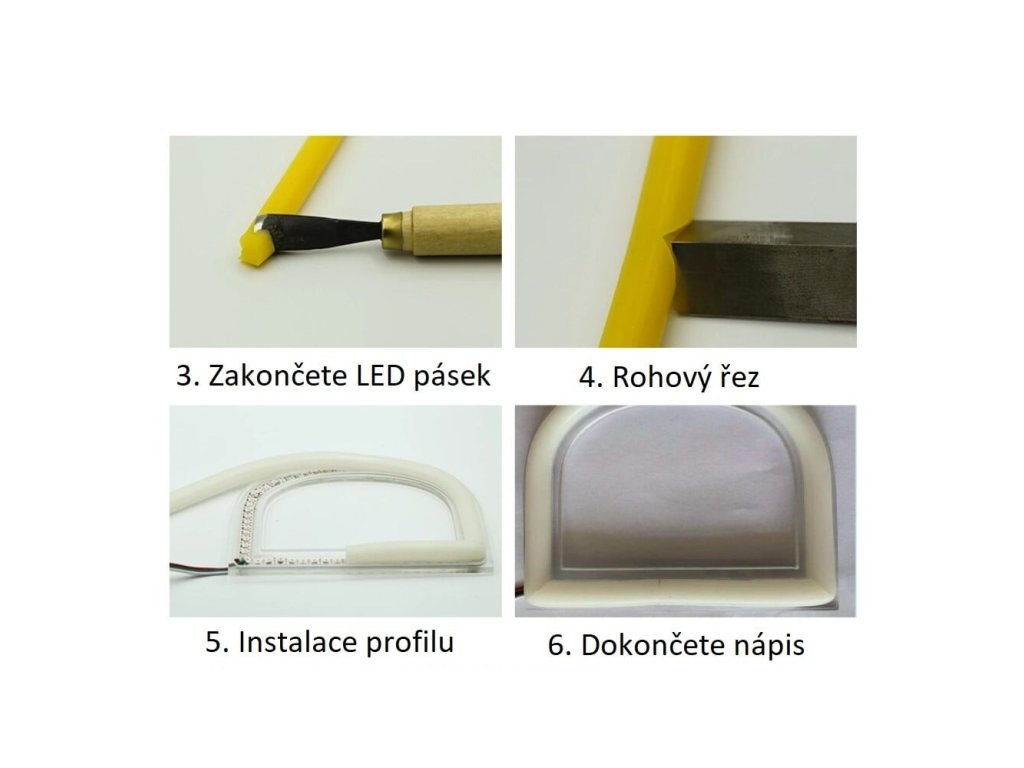 Drážka na silikonový profil se frézuje pomocí gravírovací frézy, která zanechá po stranách drážky úchyty, na které můžete silikonový profil D810 zacvaknout. Tento silikonový profil překrývá nalepené LED pásky v samotné drážce. V případě potřeby tvarování do zaoblených tvarů, jako jsou písmena, se doporučuje kombinovat s LED pásky ohebnými do stran. Silikonové profily jsou k dispozici v různých barevných variantách. Většinu profilů můžete kombinovat s LED pásky ve studeně bílé barvě, případně můžete kombinovat LED pásek ve stejné barvě s profile (červený profil s červeným LED páskem). Pokud potřebujete dosáhnout teplé bílé barvy, lze použít bílý silikový profil v kombinaci s teplým bílým LED páskem. Obdobný postup platí i například pro denní bílou barvu.