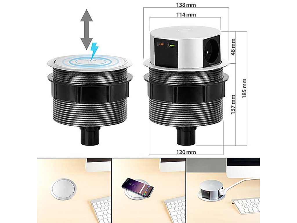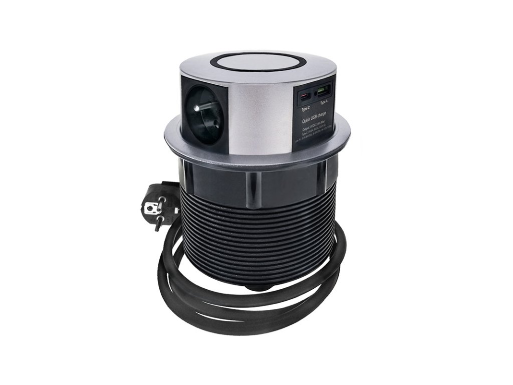 Tento výsuvný blok zásuvek přináší vše potřebné pro moderní pracovní plochu. Tři síťové zásuvky 230V, USB-A a USB-C porty s rychlým nabíjením a integrovaná bezdrátová nabíječka s výkonem až 10 W tvoří kompaktní řešení pro každodenní používání. Stříbrné provedení vrchního krytu elegantně zapadne do pracovního stolu, kuchyňské linky nebo konferenční místnosti.