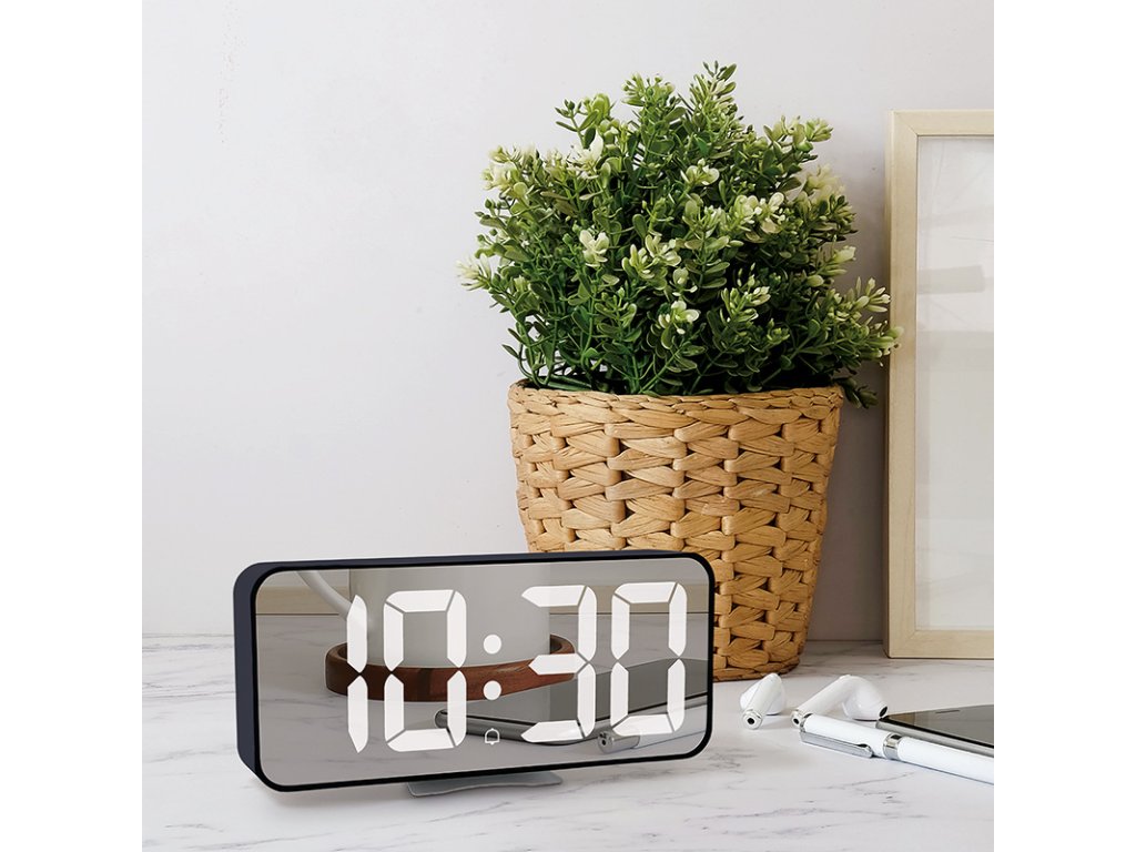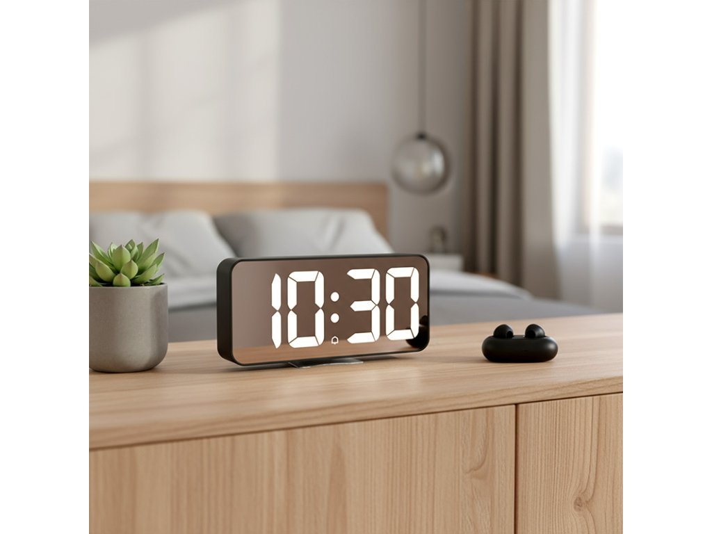 - zrcadlový LED displej zobrazující čas nebo teplotu (možnost přepínání zobrazení)