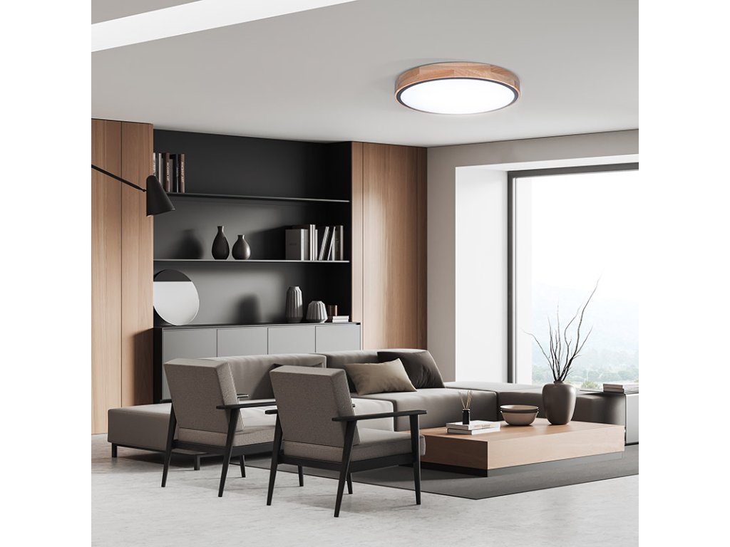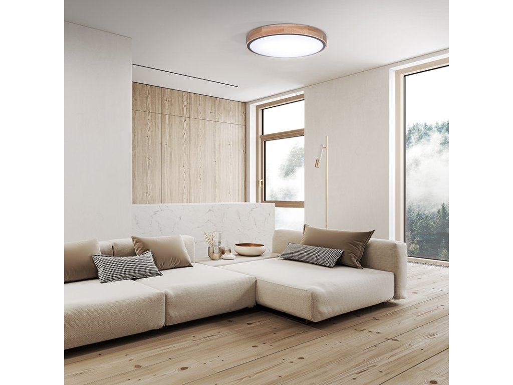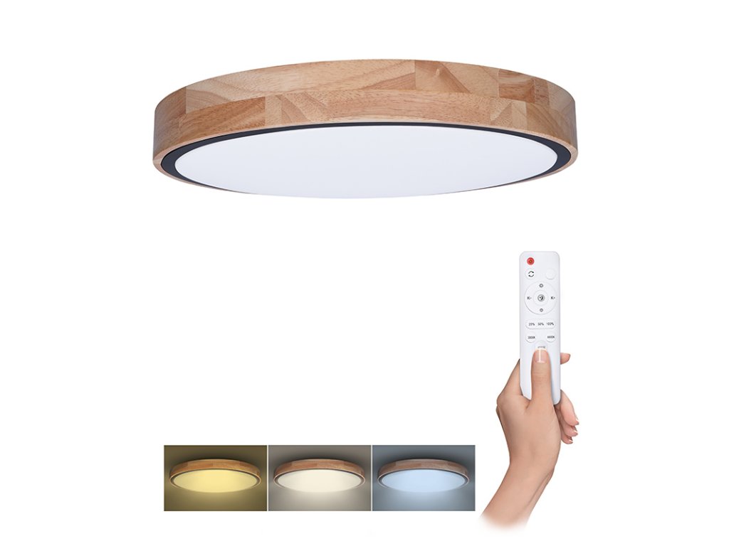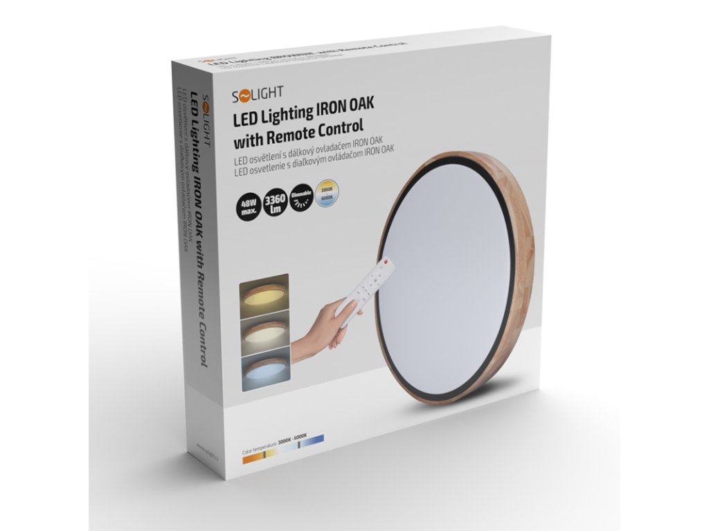 Luxusní LED stmívatelné svítidlo Iron Oak spojuje přírodní estetiku masivního dubu s moderní technologií. Osvětlení je vybaveno dálkovým ovládáním, které umožňuje volbu barevné teploty v rozsahu 3000K–6500K, plynulé stmívání i přepínání mezi světelnými režimy. Maximální příkon činí 48 W, světelný tok dosahuje až 3360 lm (pro 4000K).
