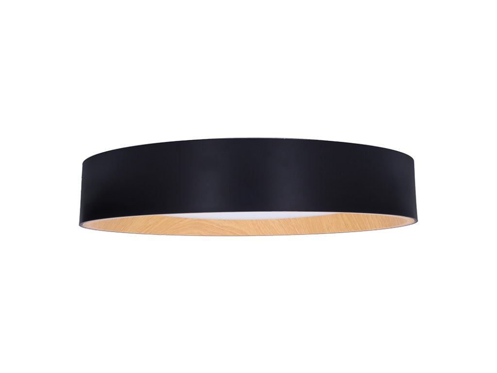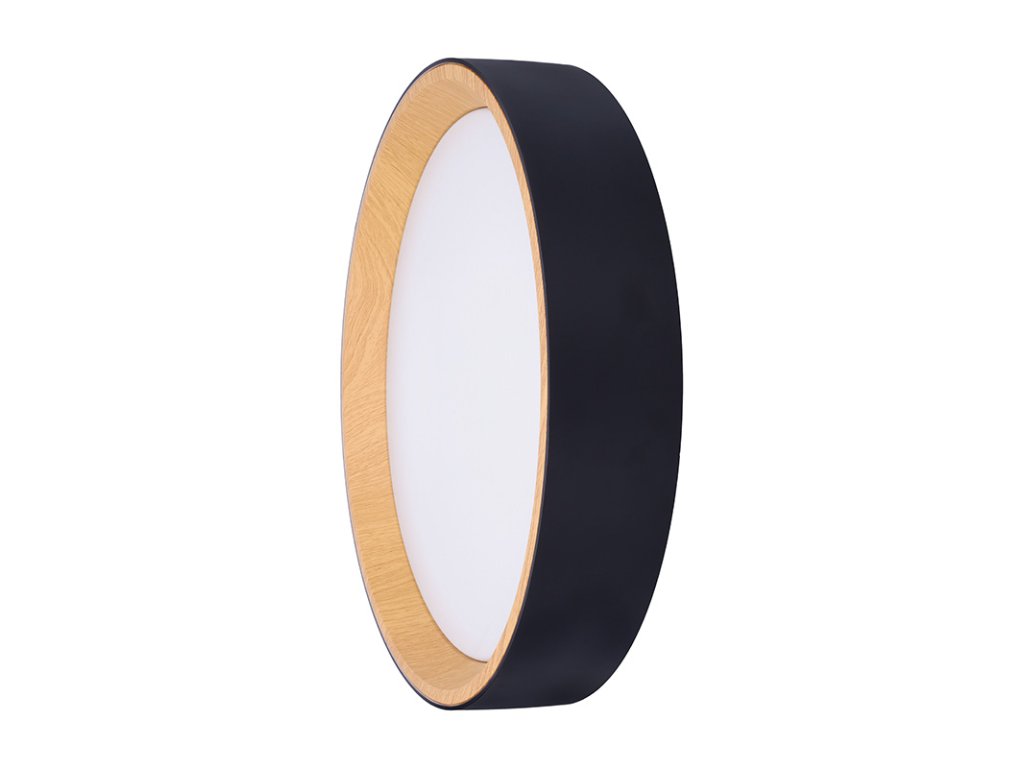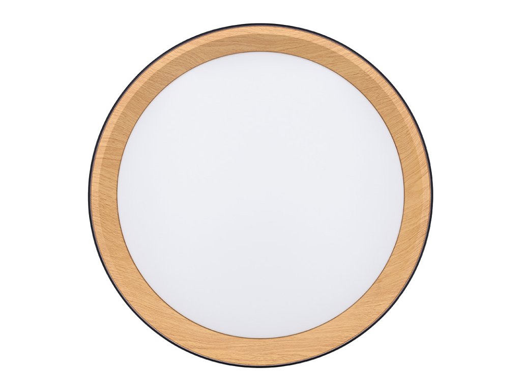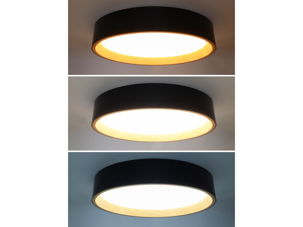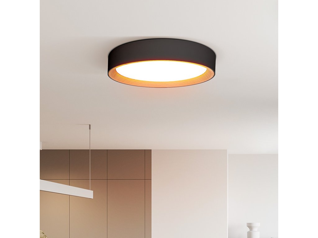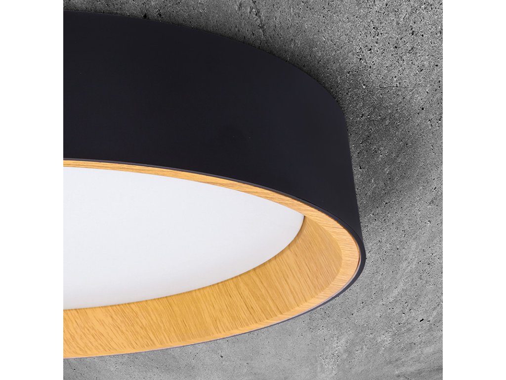 Design v elegantní černé barvě s imitací dřevěného dekoru vnitřního prstence dodává interiéru příjemný a přírodní vzhled. Díky dálkovému ovladači můžete snadno regulovat intenzitu světla, teplotu (3000K - 6500K) i výběr přednastavených režimů osvětlení, což umožňuje přizpůsobení atmosféry dle vašich potřeb.
