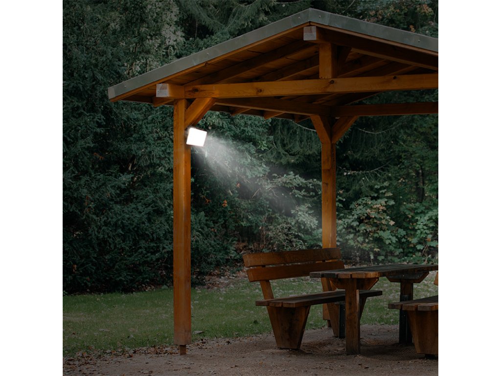 Reflektor je navržen pro snadné a bezpečné venkovní připojení – je vybaven voděodolným připojovacím konektorem pro kabely o průměru 4–8 mm. Tělo z odolného tlakově litého hliníku je chráněno krytím IP65, takže obstojí i ve ztížených klimatických podmínkách. Jeho životnost dosahuje až 25 000 hodin, což snižuje nutnost časté výměny.
