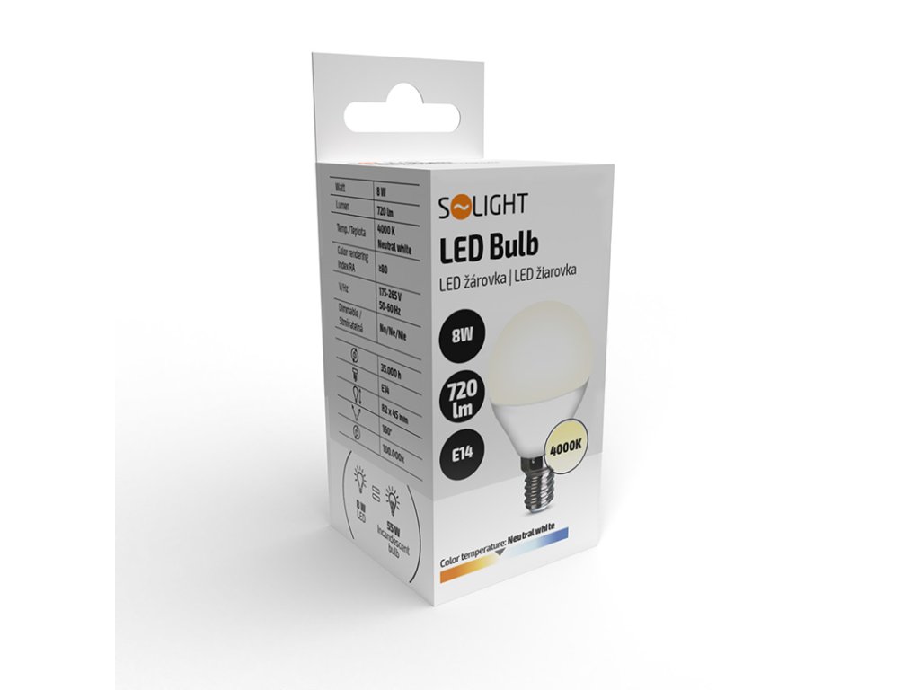 Solight LED žárovka, miniglobe, 8W, E14, 4000K, 720lm, bílé provedení