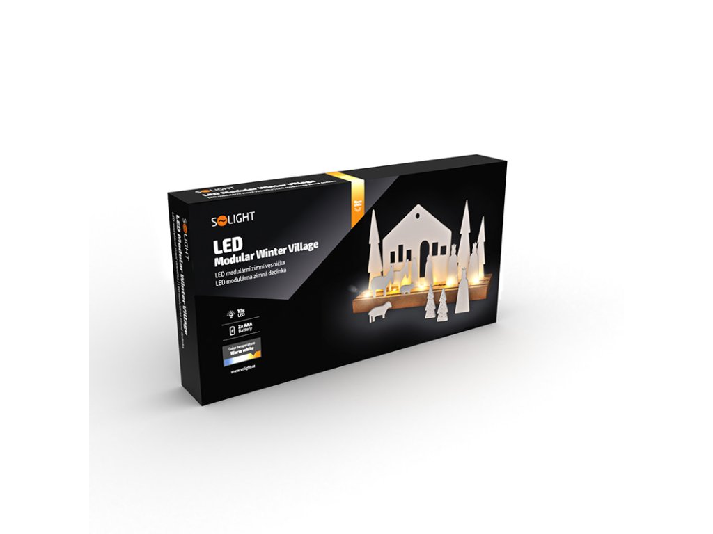 - LED modulární zimní vesnička s 15 vánočními prvky, které lze libovolně umístit na základnu
