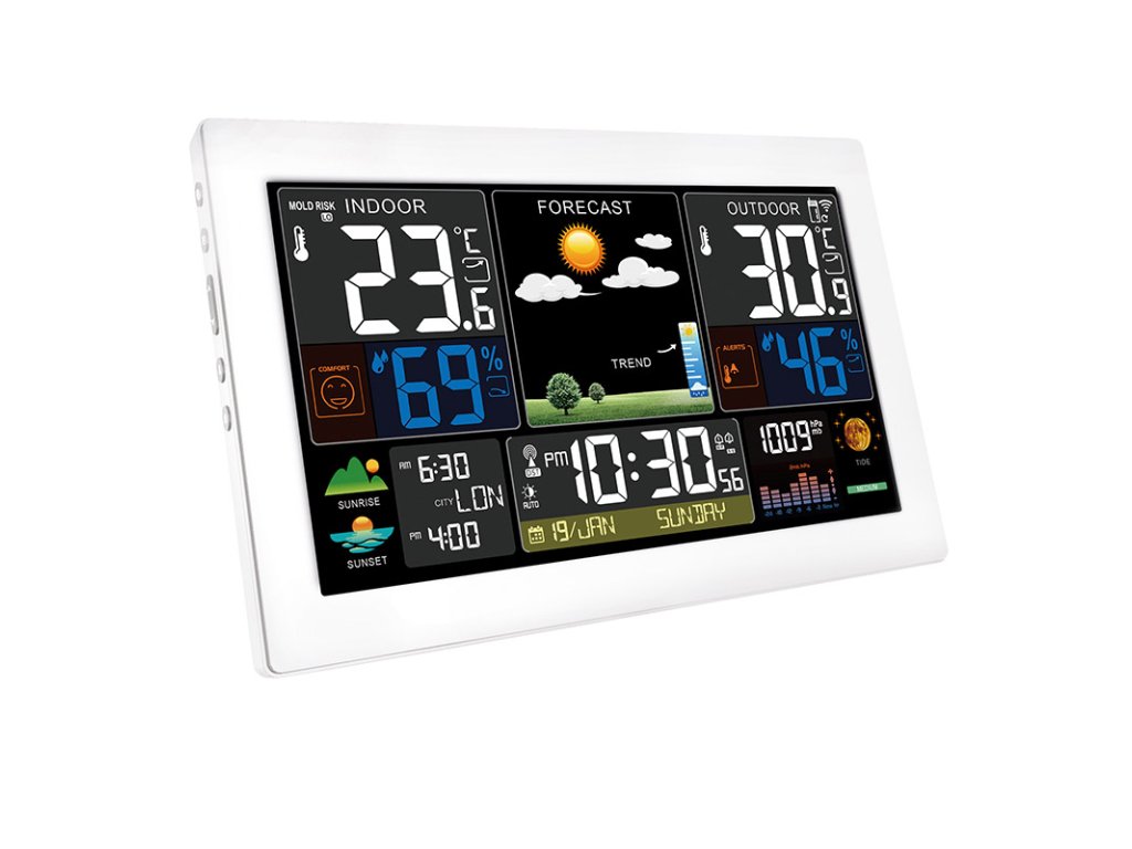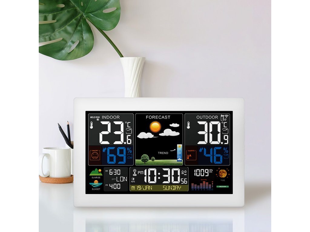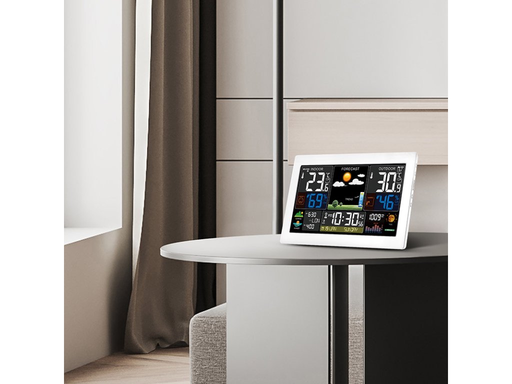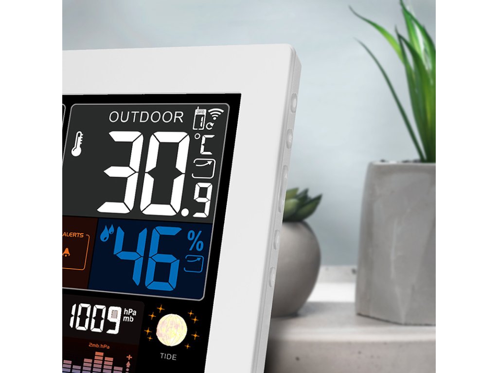 Tato meteostanice vyniká velkým, barevným a podsvíceným displejem o úhlopříčce 22,2 cm (19,3 × 11 cm), který umožňuje snadné a přehledné sledování všech naměřených hodnot i dalších funkcí. Díky jasné grafice a možnosti nastavení 5 úrovní podsvícení si můžete displej přizpůsobit podle svých potřeb a světelných podmínek v místnosti. Ovládání je navíc velmi intuitivní – dotykový senzor na horní hraně meteostanice umožňuje jednoduché rozsvícení displeje či odložení budíku pouhým dotykem. Displej zobrazuje nejen aktuální teplotu a vlhkost (vnitřní i venkovní), ale také předpověď počasí v 6 grafických úrovních, fáze Měsíce, východ a západ Slunce, atmosférický tlak a další užitečné informace. Díky svým rozměrům 22,5 × 14,5 × 3,3 cm se stane nepřehlédnutelným doplňkem vašeho interiéru, ať už ji umístíte na stůl pomocí praktického stojánku nebo ji připevníte na zeď. Přehlednost a snadné ovládání doplňuje také rychlý přístup k tlačítkům na boční straně meteostanice, což zajišťuje pohodlné nastavení a úpravu všech funkcí.