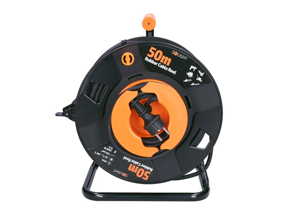 Solight prodlužovací přívod na bubnu, 1 zásuvka, venkovní, 50m gumový kabel, 3x 1,5mm2, IP44