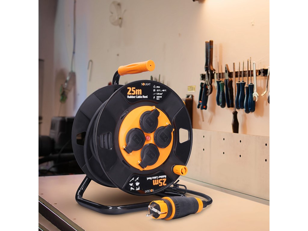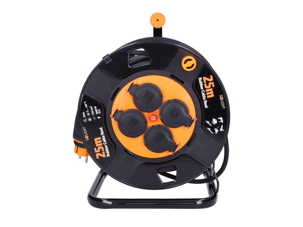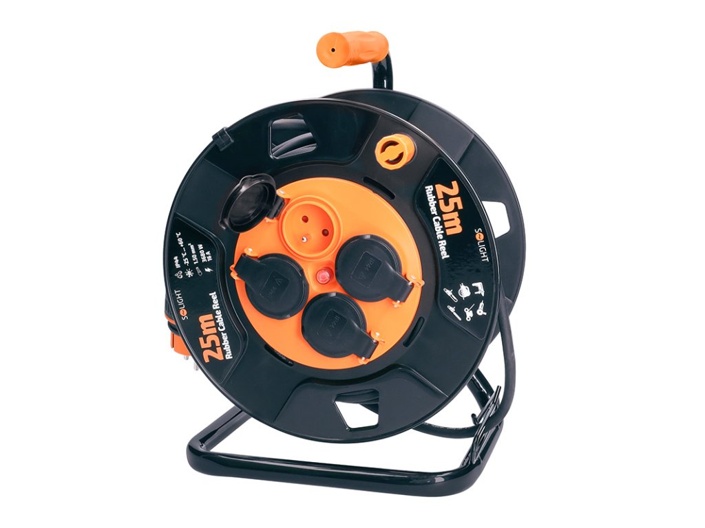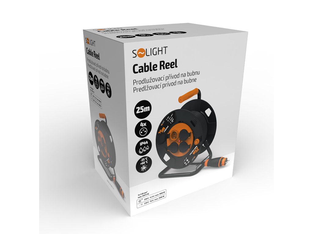 Solight prodlužovací přívod - na bubnu, 4 zásuvky, 25m kabel guma, 3x 1,5mm2, IP44