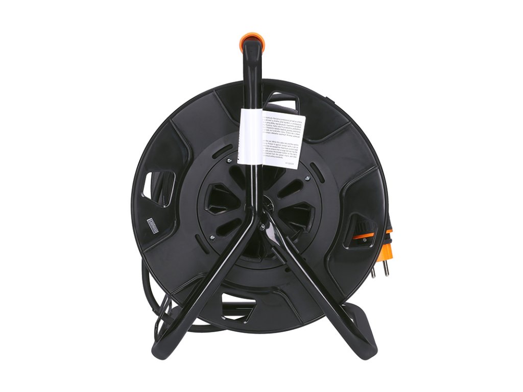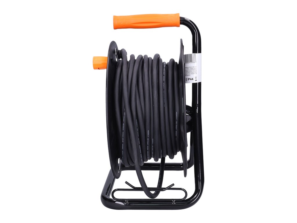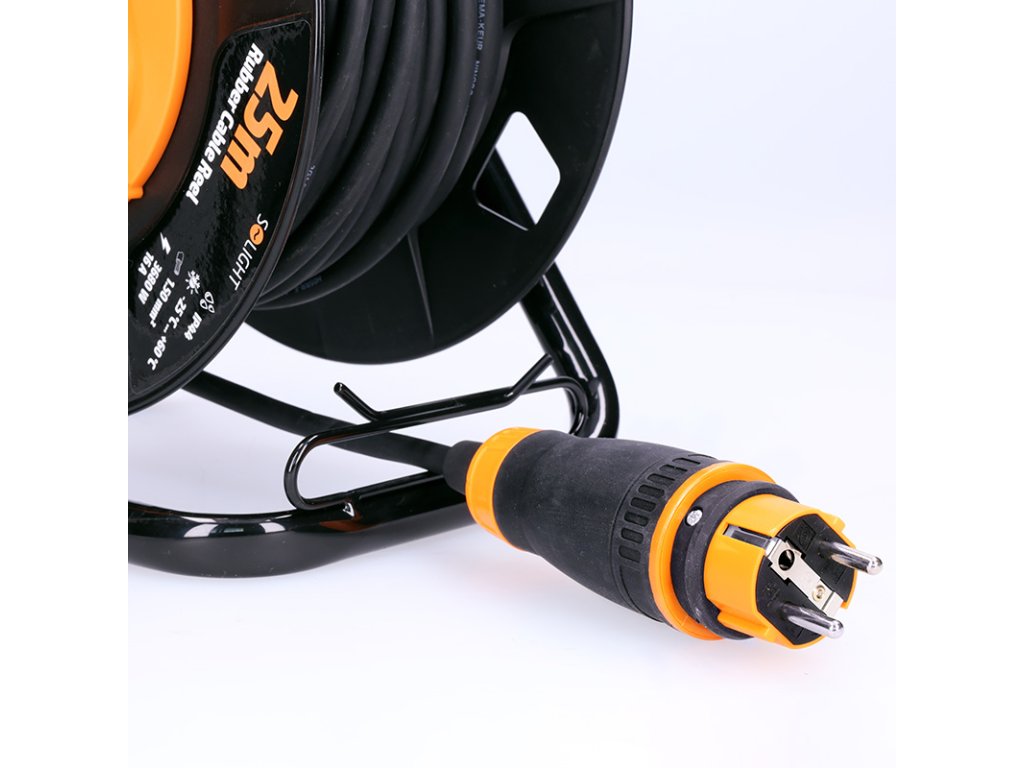Gumový kabel typ H05RR-F 3G s vodiči o průřezu 3×1,5 mm2 je vhodný pro venkovní použití i vnitřní prostory. Buben je vybaven zásuvkami s dětskými pojistkami a tepelnou pojistkou, která zajišťuje bezpečnost při přetížení nebo neúplném odvinutí kabelu. Produkt splňuje stupeň krytí IP44, který zajišťuje ochranu proti stříkající vodě. Vhodný pro bezpečné a spolehlivé připojení stavebních, zahradních i méně náročných průmyslových zařízení.