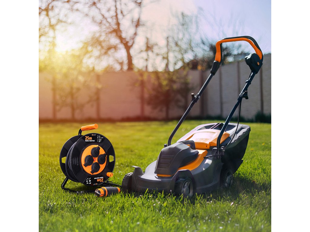 25m gumový kabel na bubnu z odolného plastu a čtyřmi zásuvkami je ideální pro použití venku, na zahradách, stavbách nebo v dílnách. Bytelná konstrukce s krytými zásuvkami i kabel samotný jsou odolné proti povětrnostním podmínkám a mechanickému namáhání.