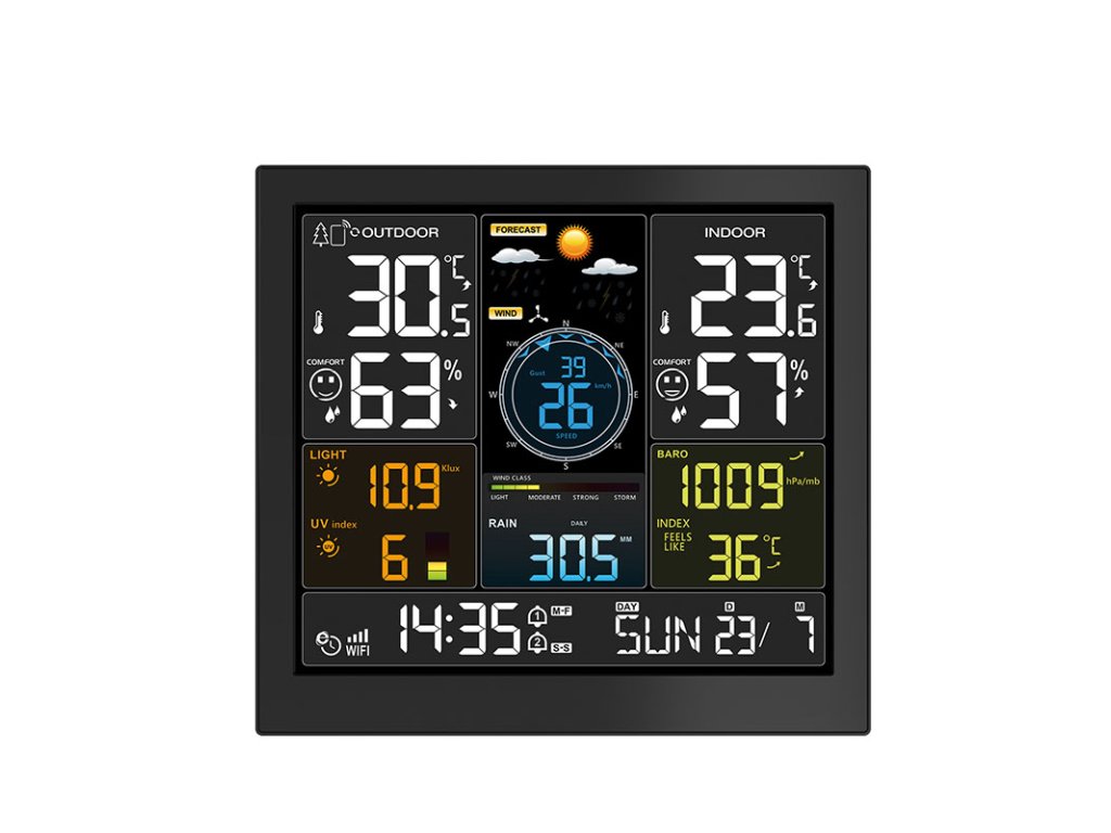 Tato profesionální meteostanice s velkým 24,4cm displejem nabízí WiFi připojení a propojení s aplikací Tuya/Smart Life pro zobrazení aktuálních hodnot a statistik. Měří vnitřní (-20 °C až 50 °C) a venkovní teplotu (-40 °C až 70 °C), vlhkost (20 % až 95 %), rychlost větru (0 až 180 km/h), směr větru (0–359°), srážky (0 až 9999 mm), atmosférický tlak (600–1100 hPa), intenzitu světla (0–128 klux) a UV index (0–15). Nabízí automatickou synchronizaci času, zobrazení dne v týdnu v 15 jazycích, dva denní budíky se snooze funkcí (5–60 min nebo vypnuto) a kalendář do roku 2099. Předpověď počasí na 12 hodin využívá tlak vzduchu a zobrazuje ikony jako slunečno, oblačno, déšť nebo sněžení. Bezdrátové senzory s dosahem až 100 m umožňují připojení 1× multi-combination senzoru a až 3 teplotních/vlhkostních senzorů. Napájení DC 5V / 1A adaptér + záložní 2× AA baterie, senzory na AAA baterie. Díky propojení s aplikací, široké škále měření a preciznímu zpracování je ideální volbou pro všechny, kdo chtějí mít meteorologická data vždy po ruce.