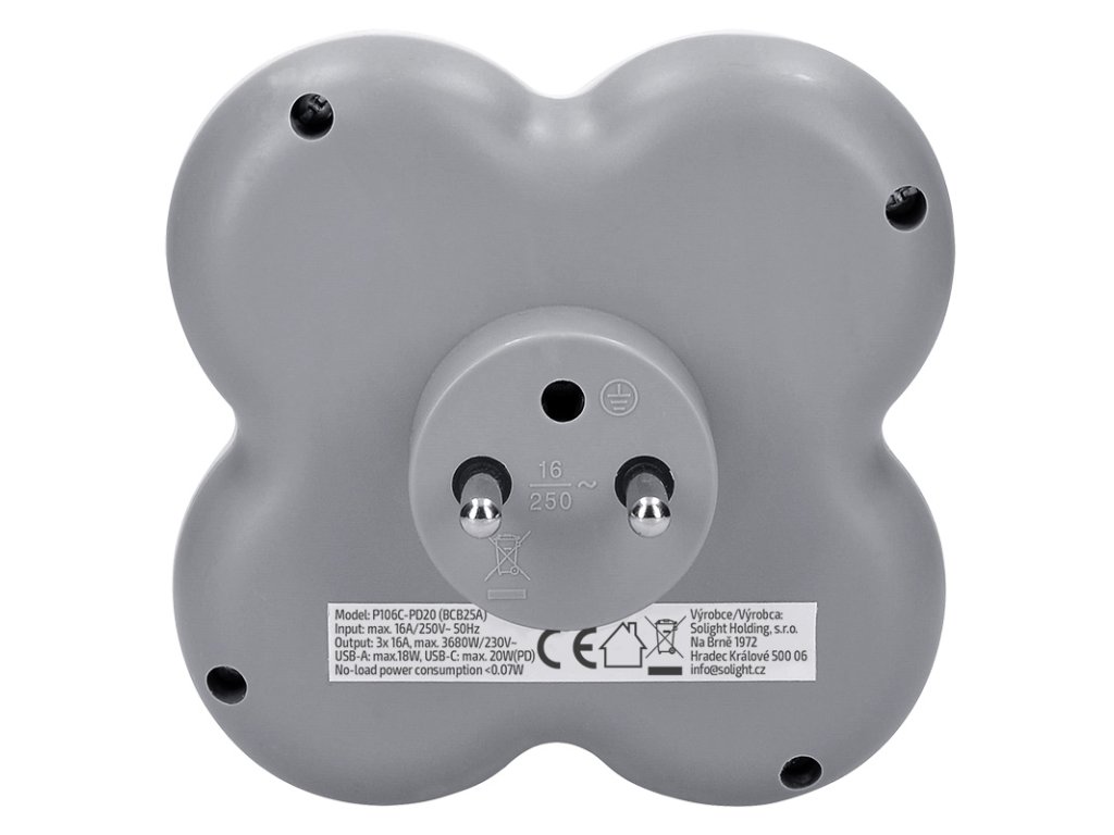 Solight rozbočka, 3x 16A, USB A+C rychlonabíječka 20W PD, bílá-šedá