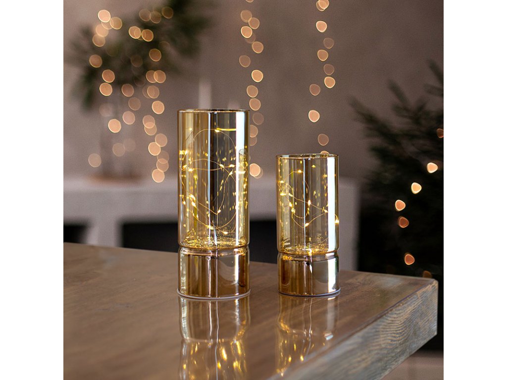 Sada obsahuje dvě skleněná světélka různých velikostí, vybavená LED diodami – menší se 10 diodami a větší s 20 diodami. Jemné světlo krásně prosvítá zlatým skleněným povrchem a vytváří působivý efekt. Díky praktickému časovači se světélka automaticky zapnou na 6 hodin a poté se na 18 hodin vypnou, což zajišťuje pohodlné a úsporné používání.