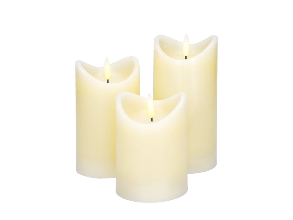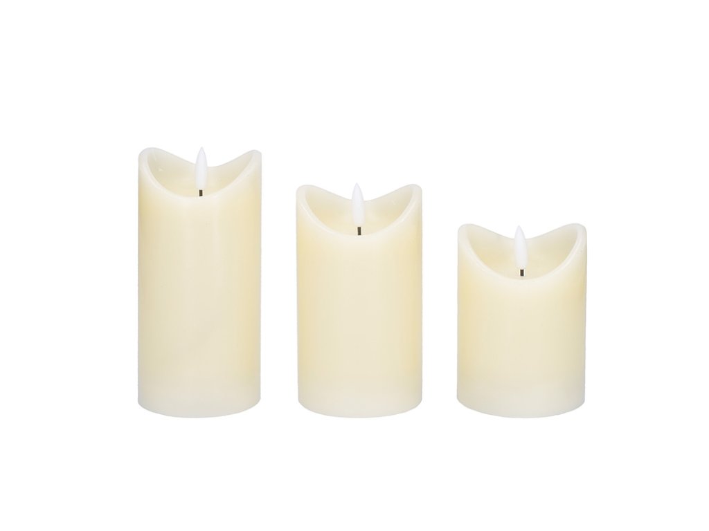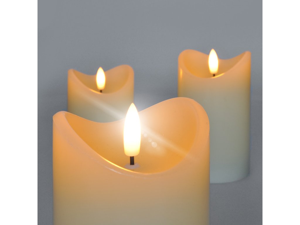 Tato sada tří voskových LED svíček nabízí realistickou náhradu klasických svíček bez rizika požáru. Každá svíčka má přirozeně blikající plamen, který věrně napodobuje skutečný oheň. Teple bílé světlo vytváří příjemnou, relaxační atmosféru, ideální pro večerní pohodu i sváteční stolování. Výšky svíček jsou 15, 12 a 10 cm, průměr 7,5 cm.