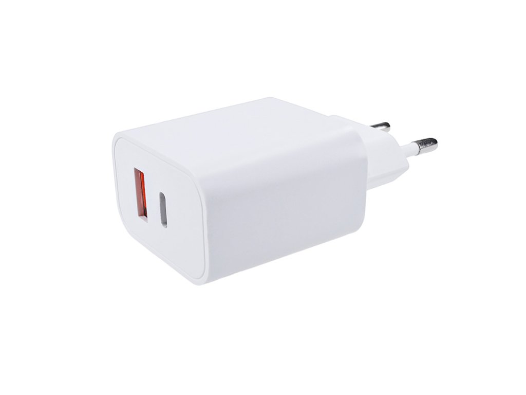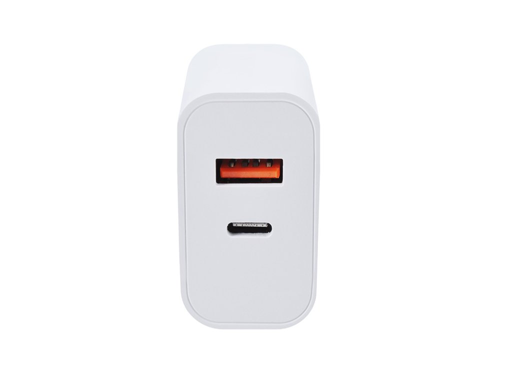 Univerzální napájecí adaptér USB A+C s výkonem 20W podporující rychlé nabíjení QC 3.0 a PD fast charge. Při použití jednoho výstupu je maximální výkon 20W, při zapojení obou výstupů je celkový výkon 20W. Vstup: AC 100 – 240V, 50/60Hz, 0.6A max. Výstup: DC 5V/3A, 9V/2.22A, 12V/1.67A, 20W max. Ochrana proti zkratu a nadproudová ochrana. Rozměry: 4,2 x 2,7 x 8 cm. Barva: bílá.