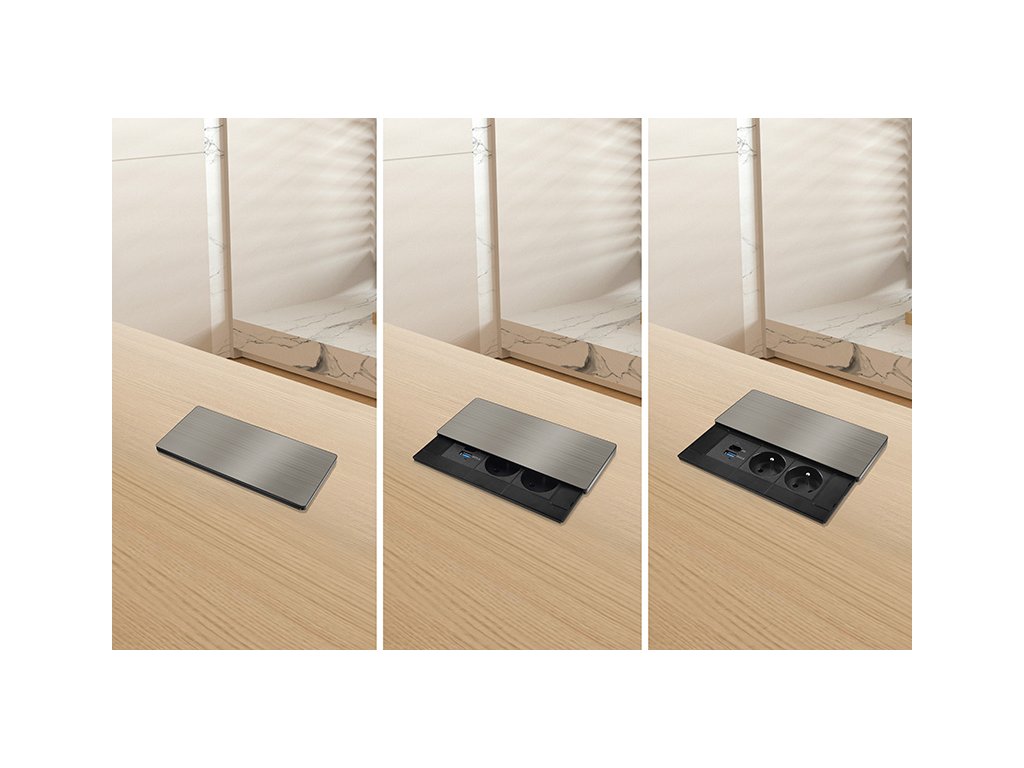 Vrchní kryt z matné tmavé nerez oceli (inox) působí elegantně a přirozeně zapadne do moderního interiéru. Nízký profil, čisté linie a nenápadné posuvné otevírání zachovávají vzhled pracovní plochy. Zásuvky i nabíjecí porty jsou kdykoli snadno přístupné jednoduchým pohybem ruky.