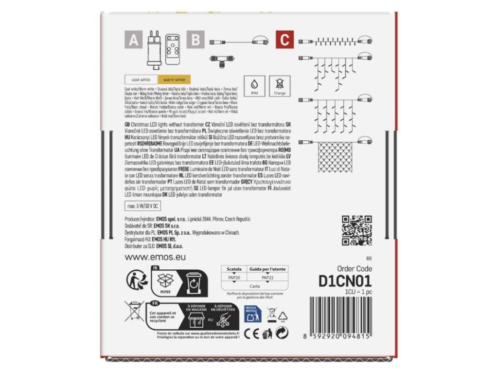 barva drátu: transparentní|barva světla: teplá/studená bílá|časovač: neuvádí se|dálkový ovladač: ne|délka přívodu: 10 cm|funkce: svítí/bliká|krytí: IP44|LED mezera: 10 cm|materiál: PVC|možnost propojení: ano|počet LED: 100|použití: venkovní i vnitřní|příkon: max. 5 W|prodejní obal: 1 ks, krabice|produkt: krápníky|pro výšku stromu: neuvádí se|rozměr: 2,5 × 0,9 m|tvar: klasický|typ napájení: síťový adaptér (není součástí balení)|velikost LED: 5 mm|vstupní napětí: 30 V DC|výstupní napětí: neuvádí se|záruční doba: 2 roky|životnost: 10 000 hodin