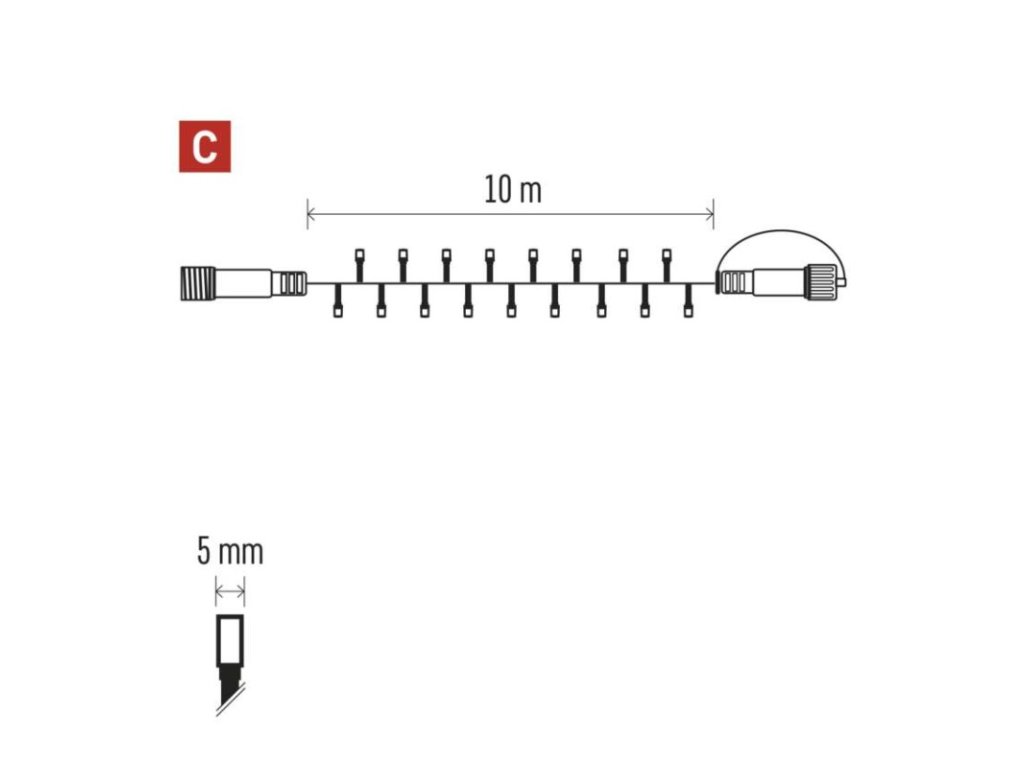 barva drátu: černá|barva světla: teplá/studená bílá|časovač: neuvádí se|dálkový ovladač: ne|délka přívodu: 10 cm|funkce: svítí|krytí: IP44|LED mezera: 10 cm|materiál: PVC|možnost propojení: ano|počet LED: 100|použití: venkovní i vnitřní|příkon: max. 5 W|prodejní obal: 1 ks, krabice|produkt: řetěz|pro výšku stromu: neuvádí se|rozměr: 10 m|tvar: klasický|typ napájení: síťový adaptér (není součástí balení)|velikost LED: 5 mm|vstupní napětí: 30 V DC|výstupní napětí: neuvádí se|záruční doba: 2 roky|životnost: 10 000 hodin