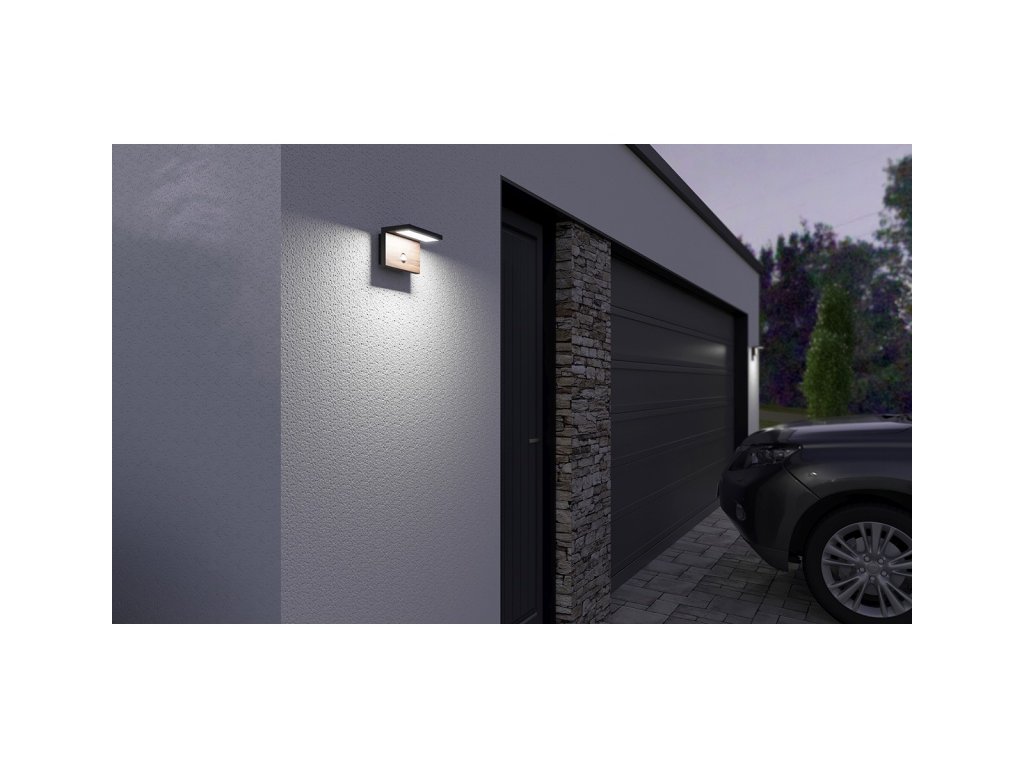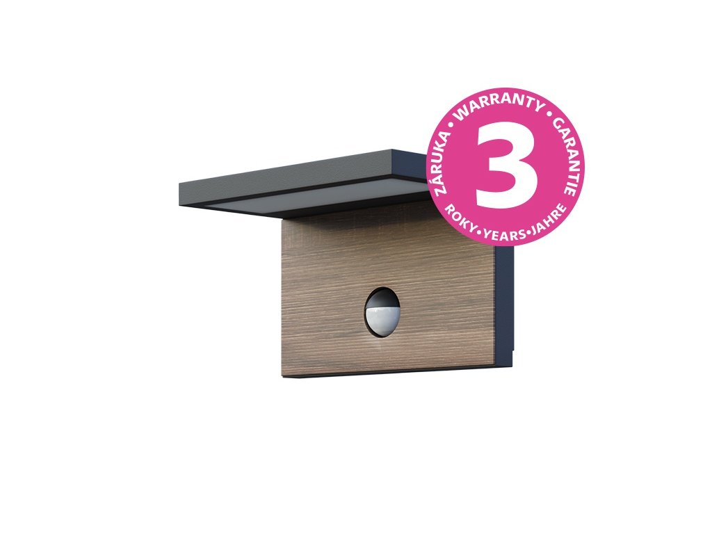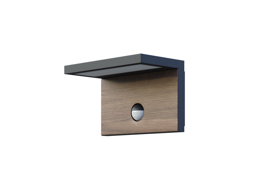Zahradní nástěnné LED svítidlo s hranatým designem s prvky v imitaci dřeva a pohybovým PIR senzorem.
