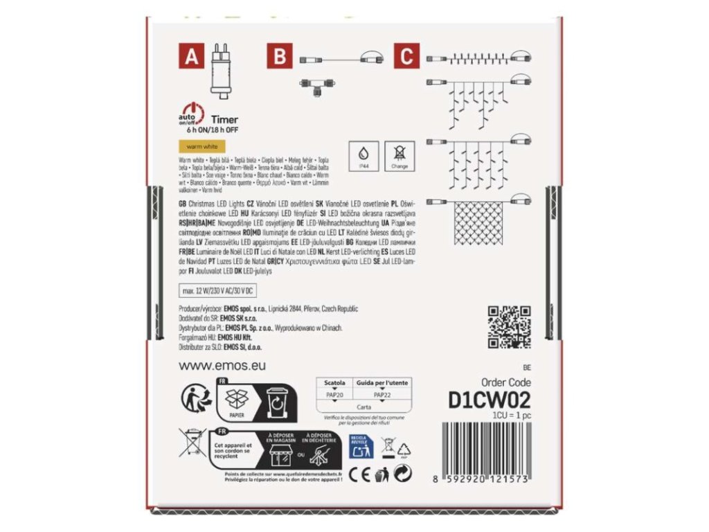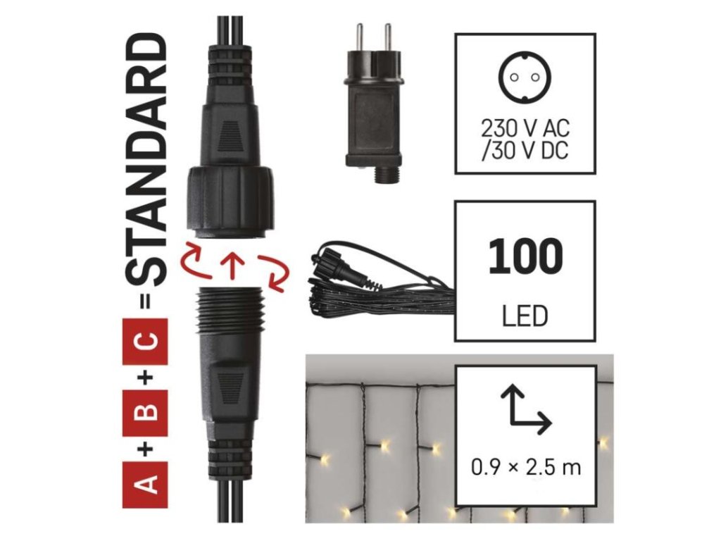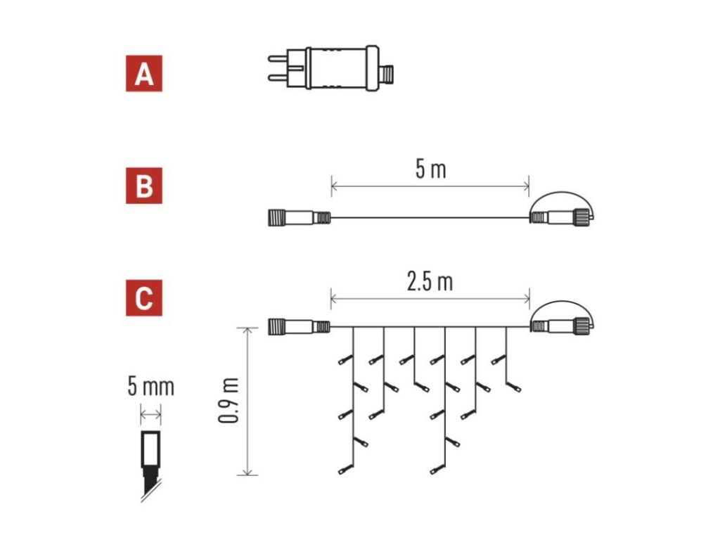 barva drátu: černá|barva světla: teplá bílá|časovač: ano|dálkový ovladač: ne|délka přívodu: 5 m|funkce: svítí|krytí: IP44|LED mezera: neuvádí se|materiál: PVC|možnost propojení: ano|počet LED: 100|použití: venkovní i vnitřní|příkon: max. 12 W|prodejní obal: 1 ks, krabice|produkt: krápníky|pro výšku stromu: neuvádí se|rozměr: 2,5 × 0,9 m|tvar: neuvádí se|typ napájení: síťový adaptér|velikost LED: neuvádí se|vstupní napětí: 230 V AC|výstupní napětí: 30 V DC|záruční doba: 2 roky|životnost: 10 000 hodin
