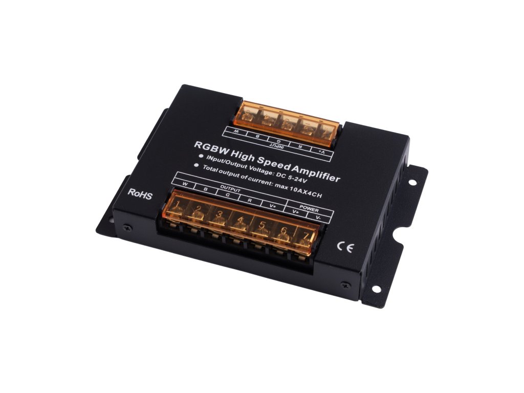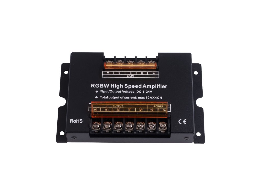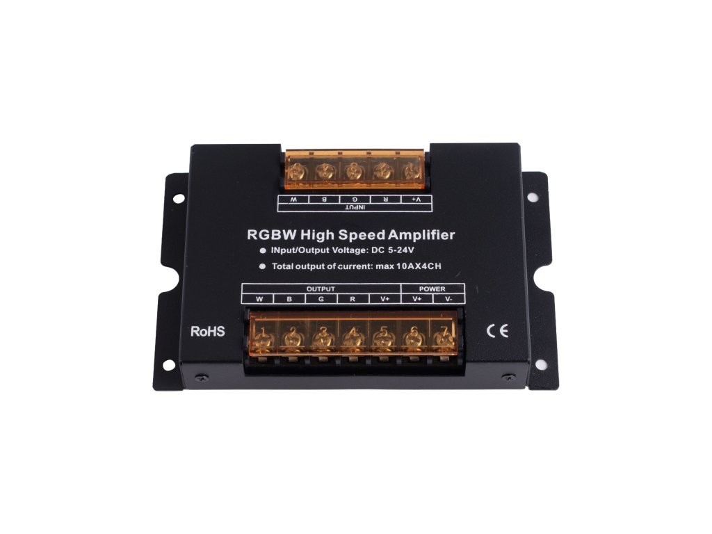 Zesilovač čtyřkanálový RGBW signálu RGBW LED produktů. Slouží k rozšíření výkonů LED ovladačů nad jejich přípustné zatížení. Například k ovladači s max. zatížením 72W připojením zesilovače přidáte další úsek o 600W. Pozor, hodnoty se nesčítají. Na zesilovač můžete připojit pouze doporučené zatížení. Možnost použití i pro zesílení signálu jednobarevných LED pásků. Na vstupu použijete společné +, pro společné mínus proklemujete vstupní svorkovnici, výstupy zapojte samostatně každý zvlášť, tzn. výstupy nepropojujte.